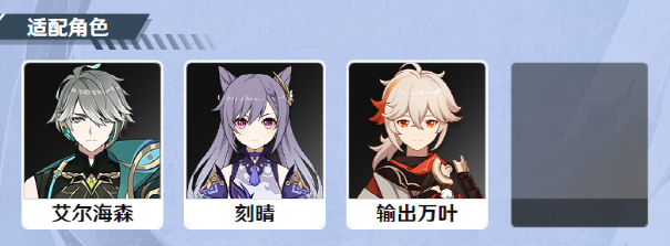 「刻晴」:刻晴在草元素反应登场之后,因自身拥有较高频的雷元素附着,在激化队伍里有了一席之地,虽然刻晴自身并没有二次利用“元素精通”的能力,但该武器也可以成为没有“雾切”时的较佳选择。
