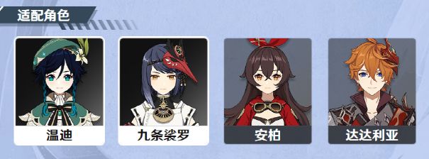 其他元素爆发倍率较高的角色定位为副C时均可以考虑佩戴该武器,比如「甘雨」「安柏」「达达利亚」等。