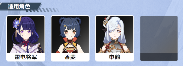 「香菱」:香菱作为一个元素爆发伤害占比极高的后台角色,该武器与其适配度极高,但和申鹤一样,需要注意能量循环。