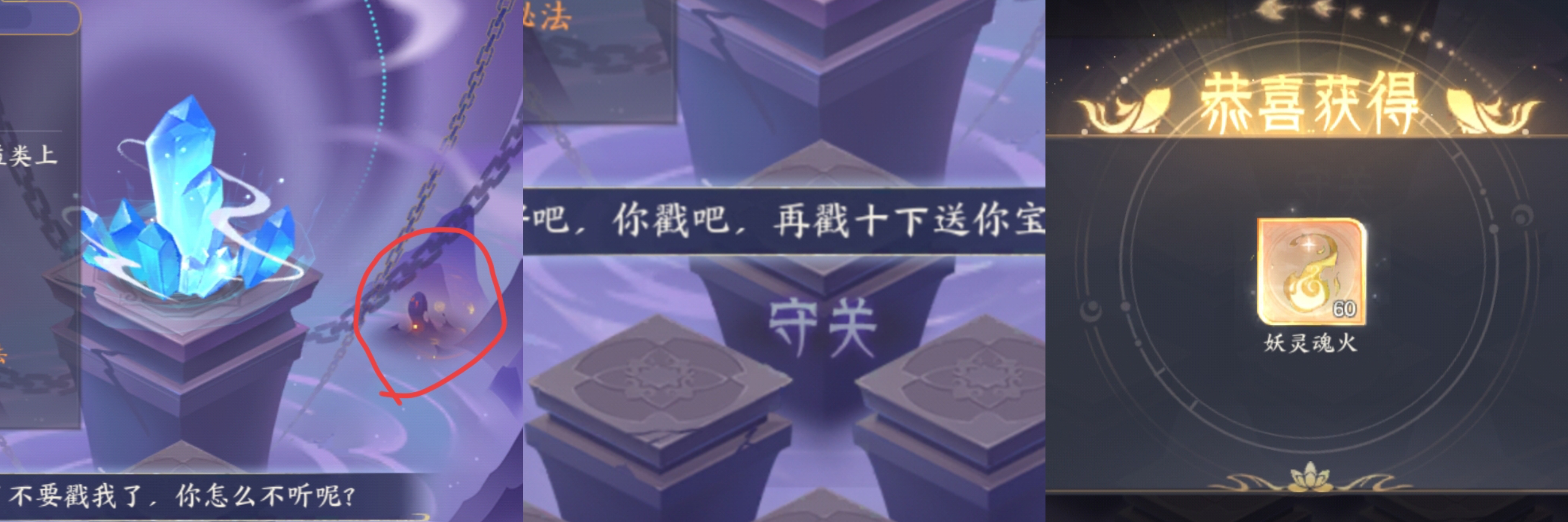 这个是最难发现的一个隐藏物品,在【斗法】里面的上古秘境水晶旁边有个类似小鬼魂的,每点击10次都会说话,👻一共需要点击几十次完成5段对话后可以获得60个妖灵