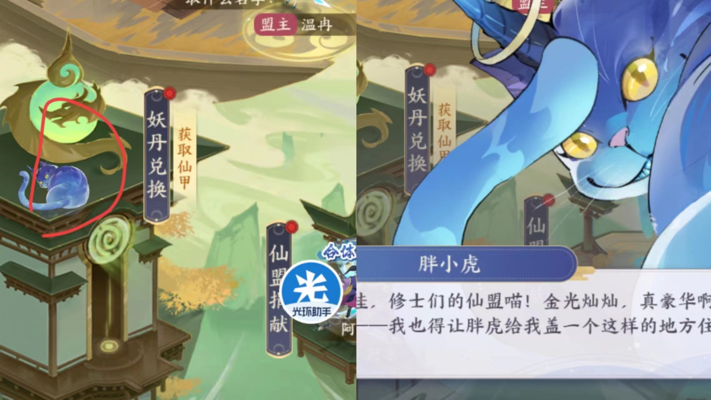 在主界面仙盟的妖丹兑换处的屋顶上,点击胖虎就完成对话就可以了。