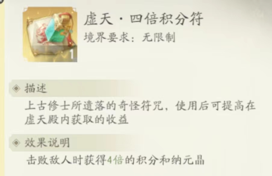 兑换虚天殿的第一个基础要求:需要准备35800个堕天松来购买40个四倍符。