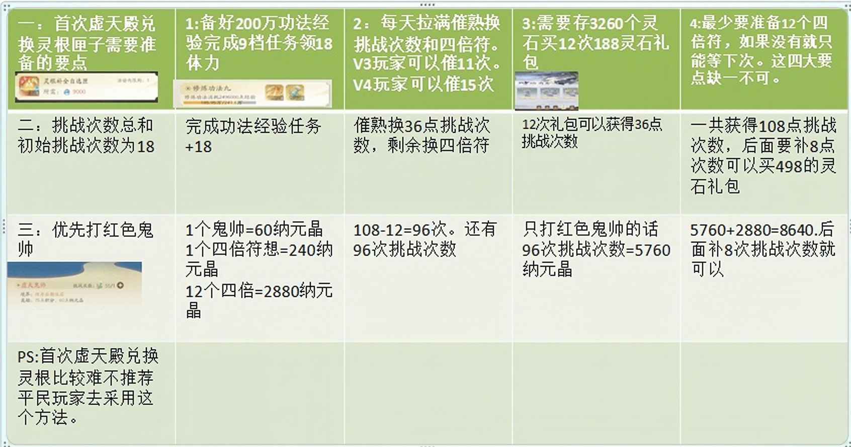 所以首次兑换灵根补全匣第二个基础要求就是虚天殿活动开启前需要存200万左右的功法经验,来获得这个18点挑战次数。如果功法不够,就把这次数存起来,等下次虚天殿活动,因为没有功法经验这18点挑战次数完成不了。