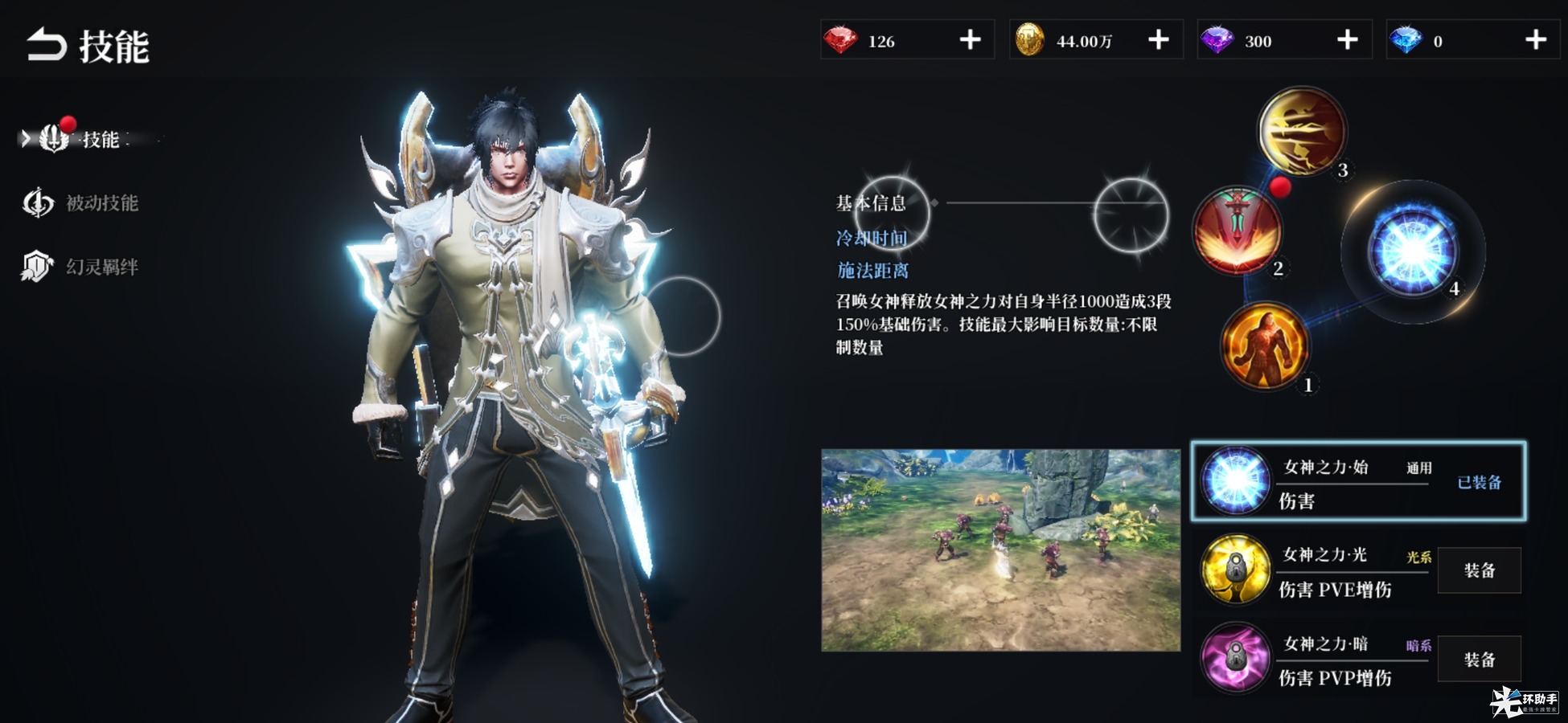 作为女神亲自赐予的核心技,使用该技能后守护者将直接召唤女神并释放女神之力,来自女神的强大神力会直接对自身半径1000码内的目标造成三段150%的基础伤害,同时这也是唯一一个不限制技能影响目标数量的技能。同时,随着守护者实力的提升,守护者将可以召唤强大的光之女神或者暗之女神,两种女神之力将大幅提升守护者对PVP目标造成的技能伤害,在玩家之间战斗时,该技能的伤害加成将非常客观。