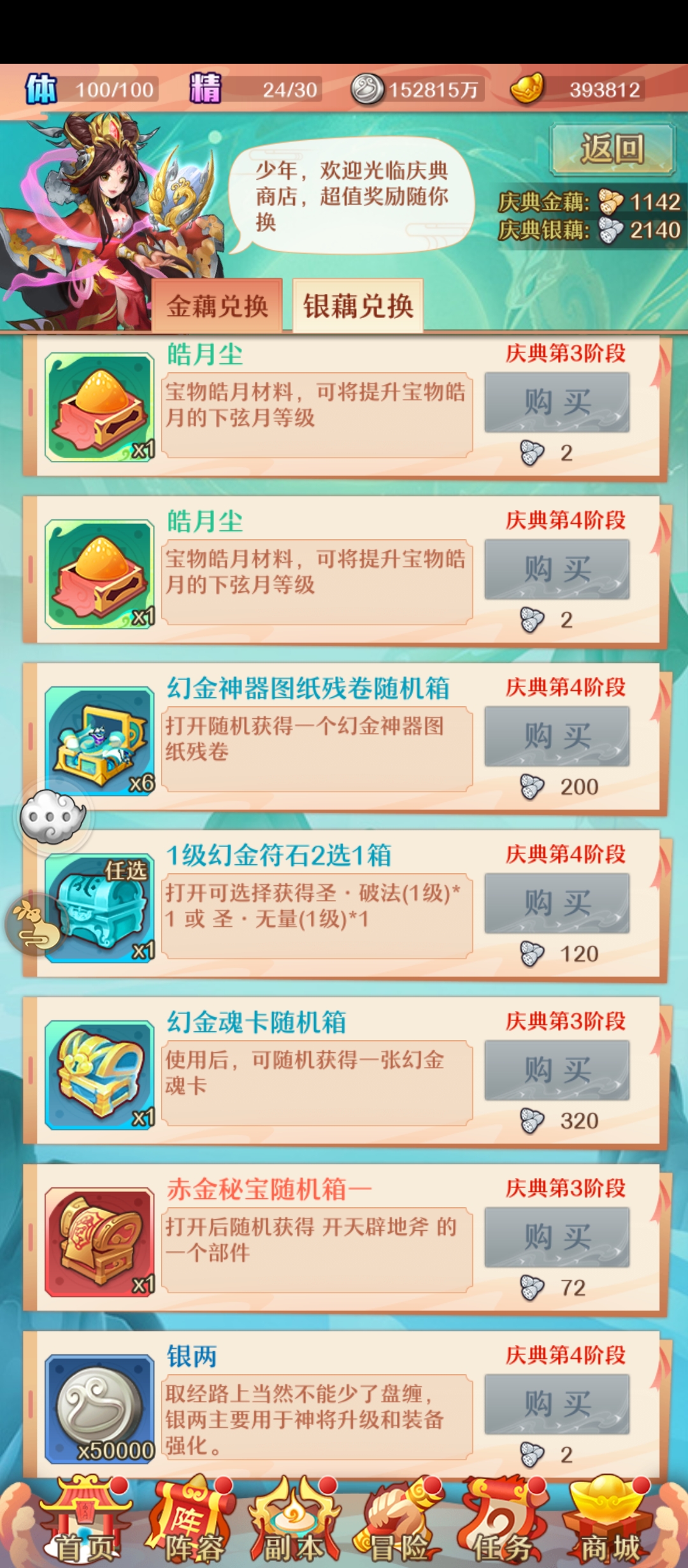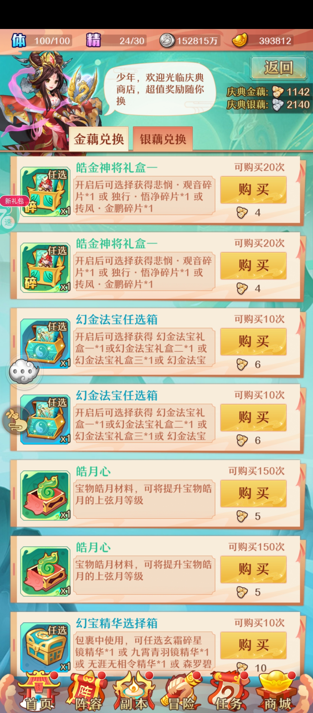 商店货物清单:皓金神将礼盒一*80、皓金法宝礼盒一*40、皓月心*600、幻宝精华选择箱*30、高级星格洗练石*140、幻金神器图纸残卷*12、1级幻金符石2选1箱*2、幻金魂卡随机箱*2、赤金秘宝随机箱一*2等。