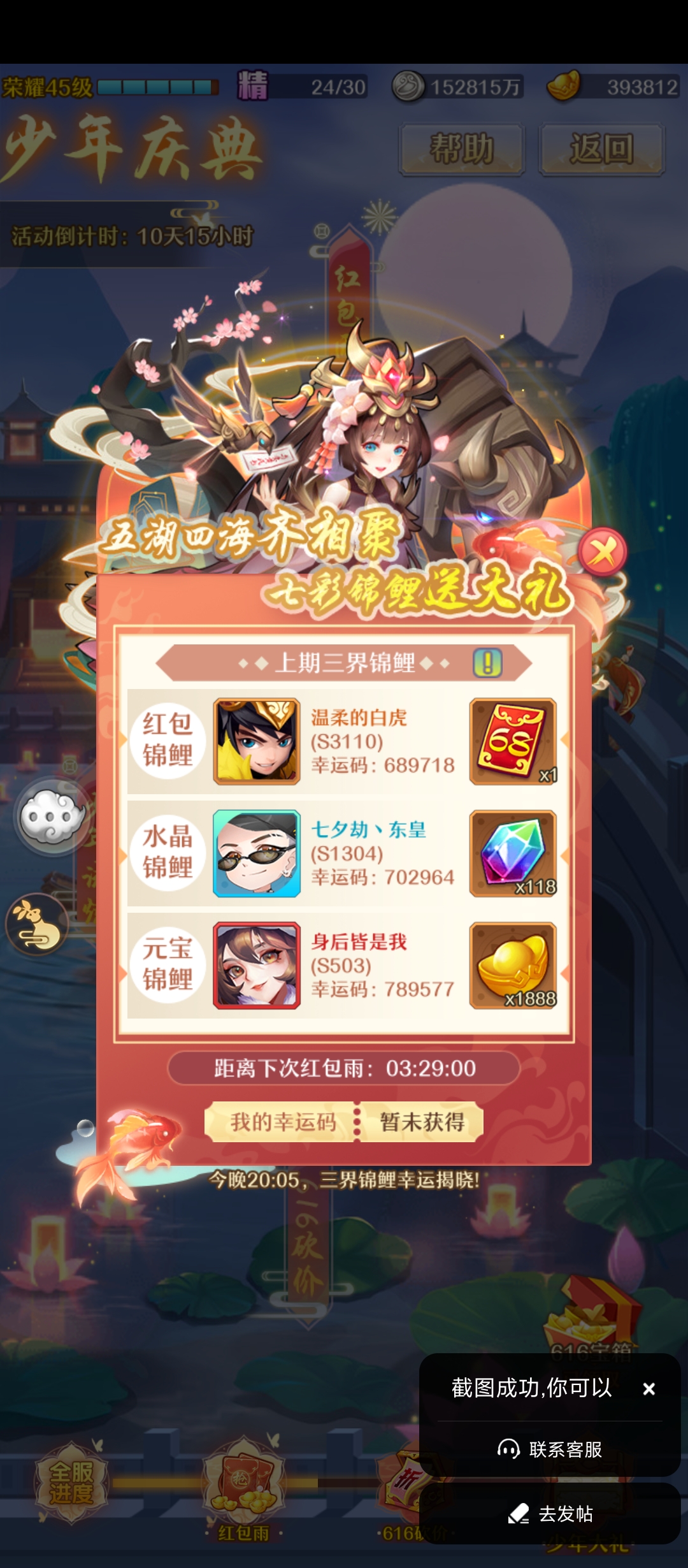 与此同时,参与活动的少年还会获得一条幸运码,每天20:05 时系统会从所有幸运码中抽取3条,赠送对应的少年锦鲤大奖!