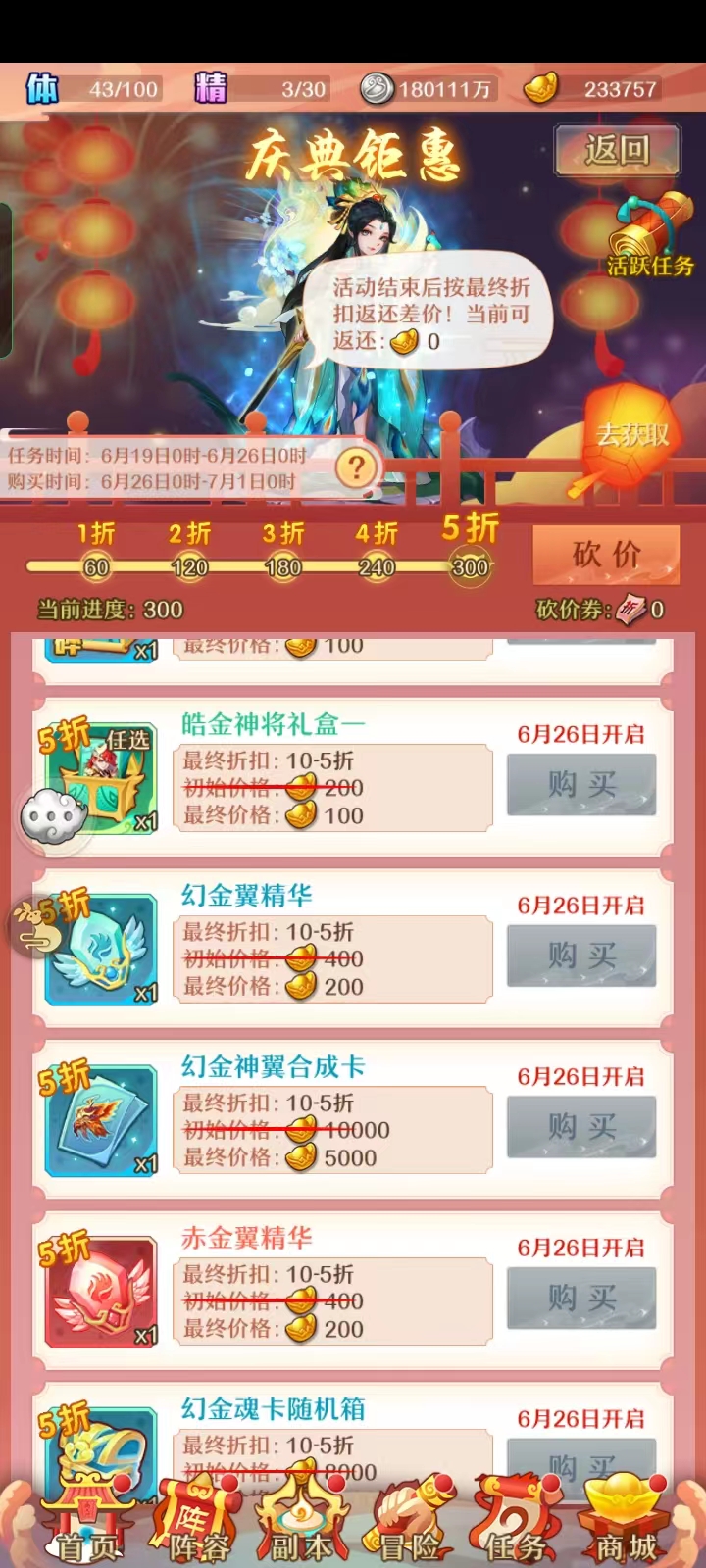 该阶段开启后,少年们完成各类活动任务即可赢取砍价券,最低可砍至5折,前所未有低价获极品资源!