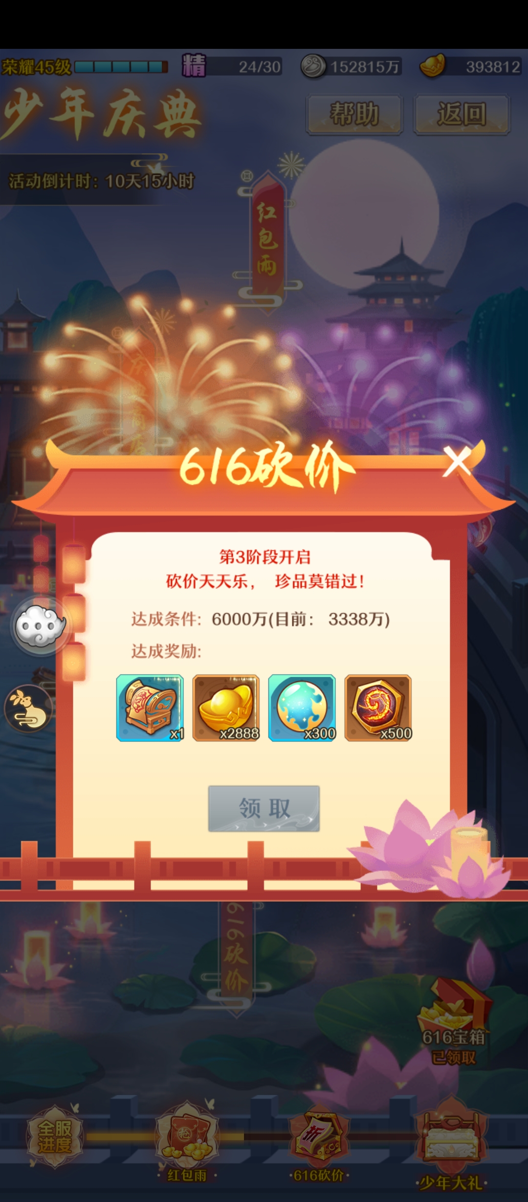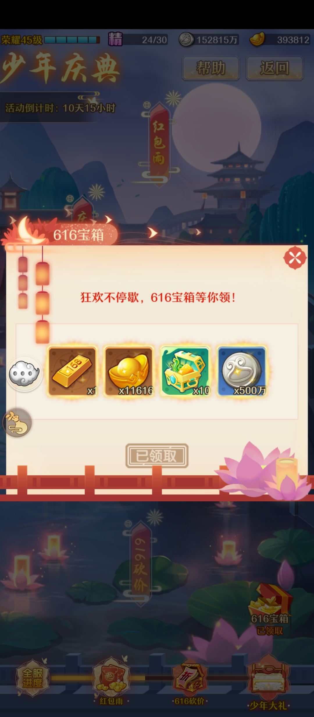 616少年节当日,少年们还可获得616宝箱,打开可获得元宝*11616、168金条*1、银两*500万、皓金宝物养成包*10!