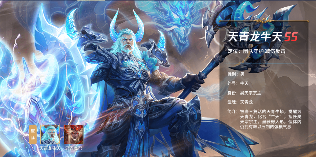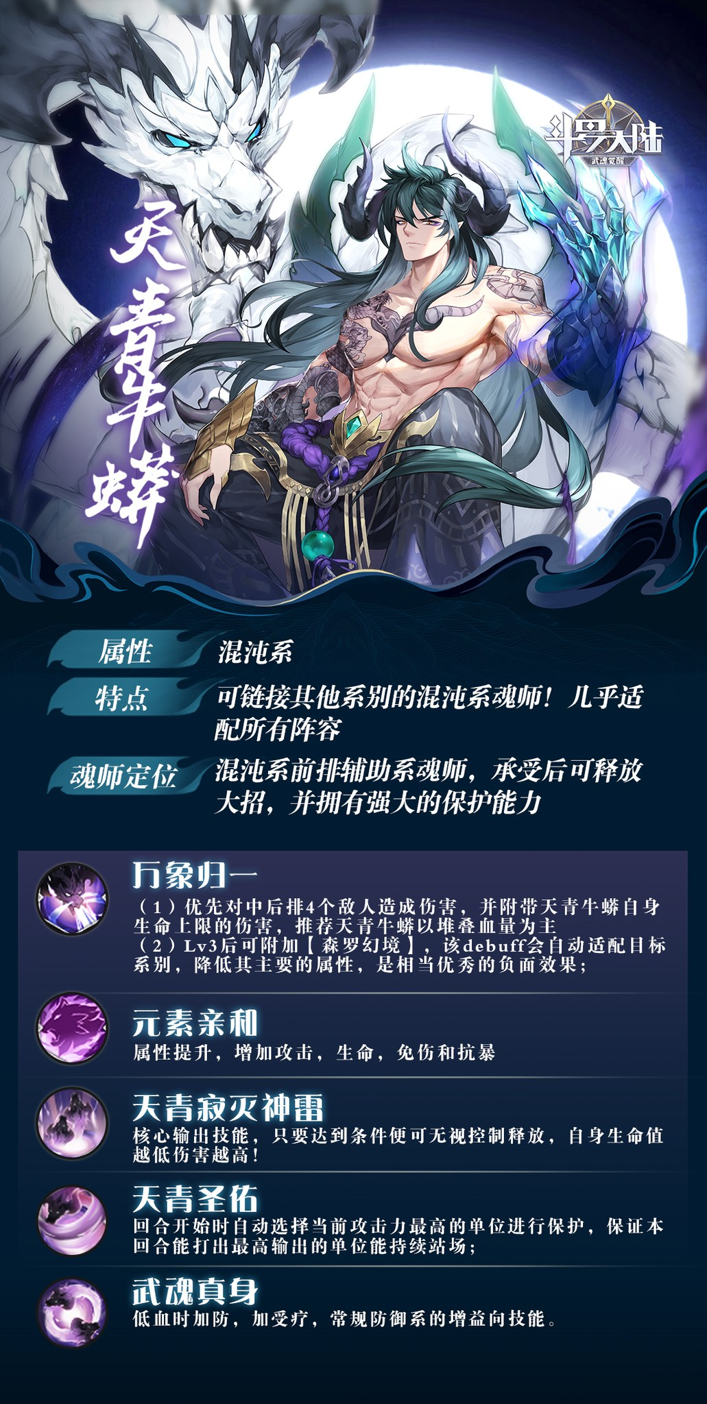 而在新斗罗大陆这个同样是卡牌策略类型的游戏中,人形态的天青牛蟒也是早早就登场过了,其技能特征也是以防御反击+辅助为主,所以为什么这么多斗罗大陆IP游戏的官方都会不约而同的将天青牛蟒设定为一位具有更强防辅系气息的魂师呢?这或者真的和天青牛蟒那雄伟的身姿有不小的关系吧,毕竟这么大一坨,不用来抗伤那还能用来干什么?