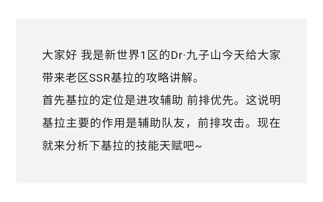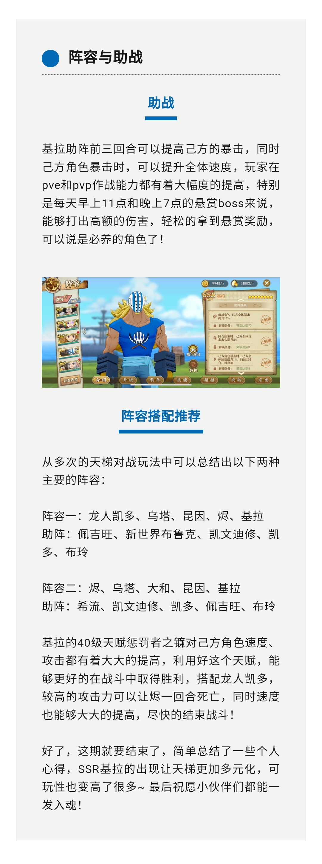 船长攻略投稿丨多元化战斗,老区SSR基拉攻略分享諾米🐾发布于 2023-06-20关注基拉登场【老区】后,究竟该如何培养呢? 让我们一起来看看船长攻略分享吧~! 本期攻略由Dr·九子山船长投稿~ 感谢船长的分享PS:本次攻略为玩家投稿,仅供参考,不代表官方立场,官方君欢迎每一位船长带来自己对角色的攻略和看法哦