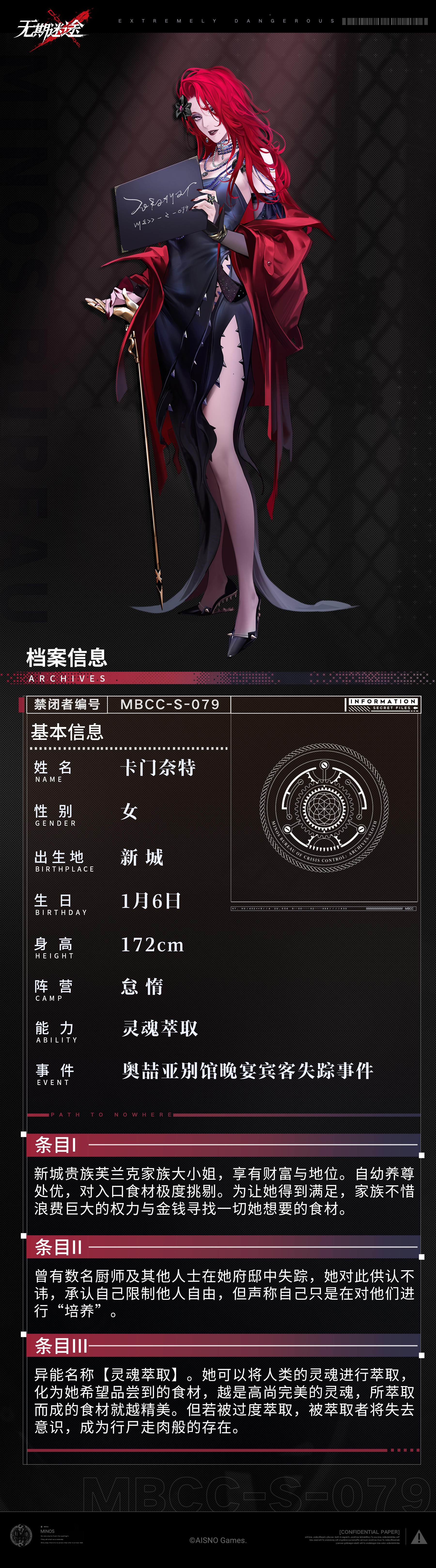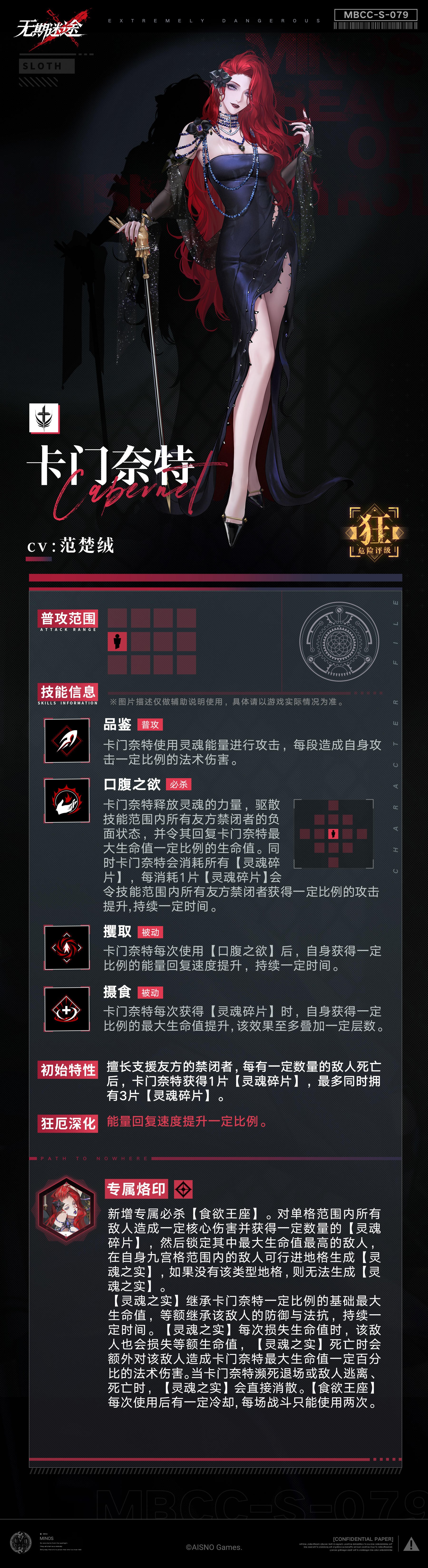 【禁闭者档案】丨MBCC-S-079「卡门奈特」白喵岚岚发布于 2023-06-20关注■禁闭者MBCC-S-079卡门奈特■启迪 Catalyst Tendency「看来你也很期待与我一起用餐,对吗?」 ■图片描述、技能效果和显示数值仅做辅助说明使用,非最终版本,具体请以游戏内实际情况为准。