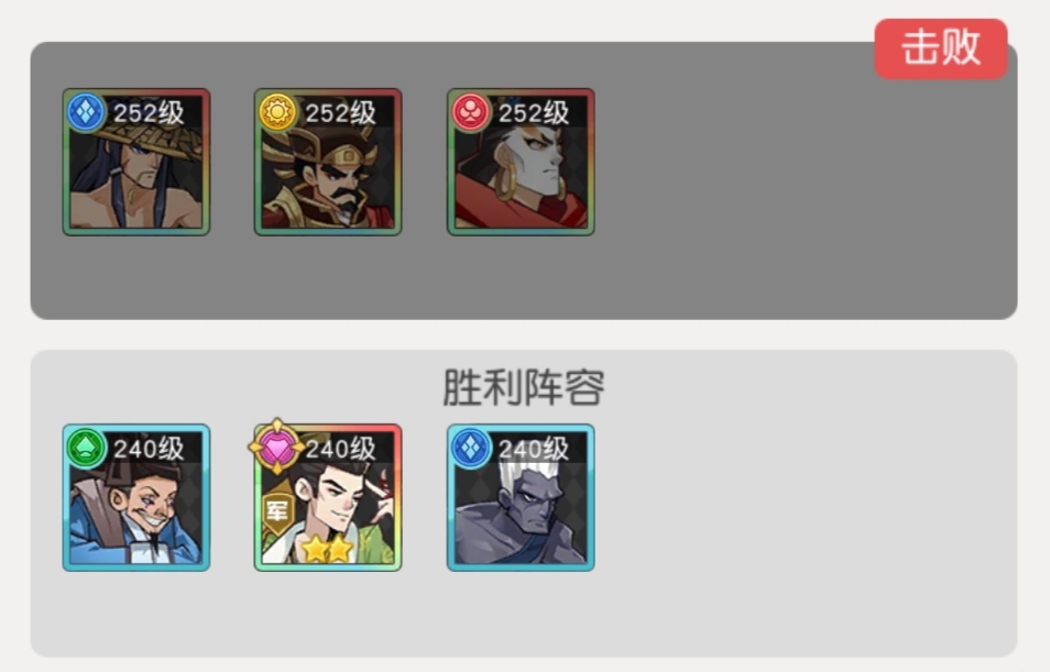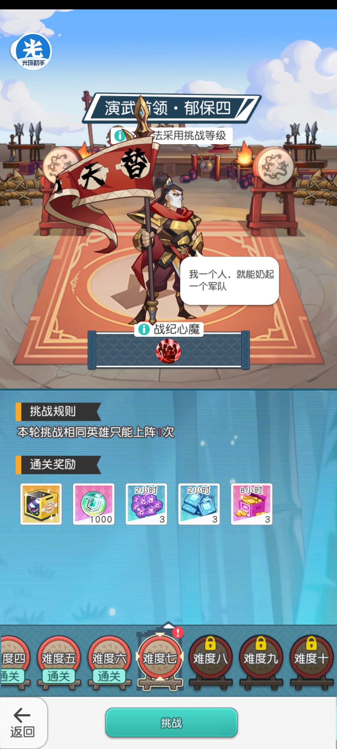 2.敌方英雄(神话徐宁、神话白胜、神话郁保四)VS我方英雄(史诗+秦明、史诗+杨雄、史诗阮小七),站位:秦明1号位、杨雄2号位、阮小七随意(正常输出即可),该阵容应对关卡难度:★☆,一次性过关几率:99%。