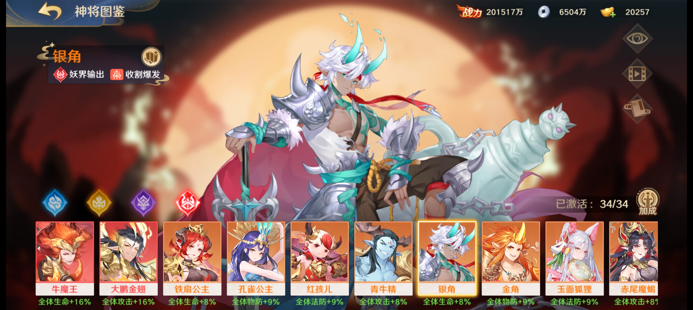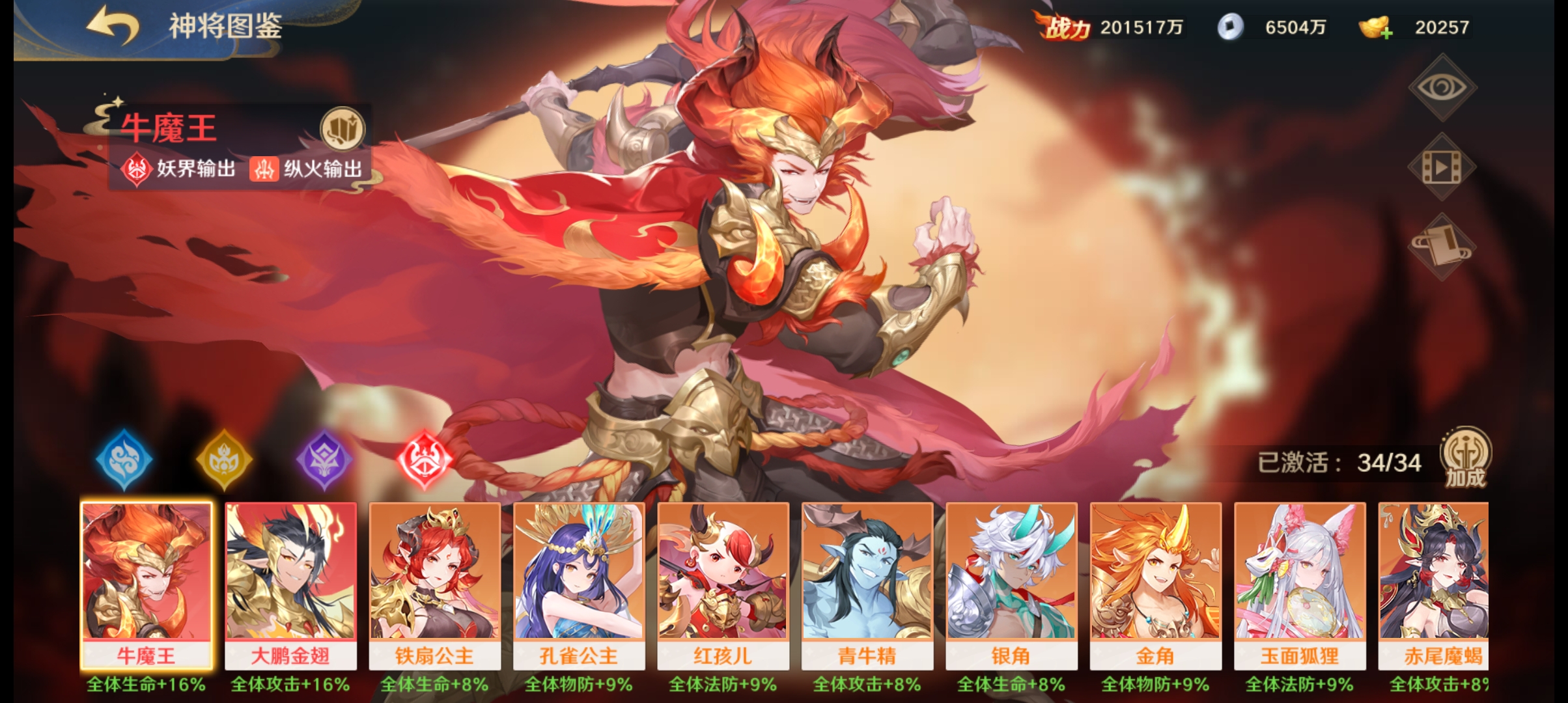 阵容如下:狐狸、金角、牛魔王、铁扇公主、孔雀公主、主角(玉面狐狸)。