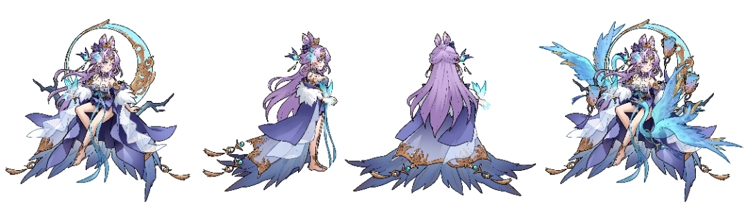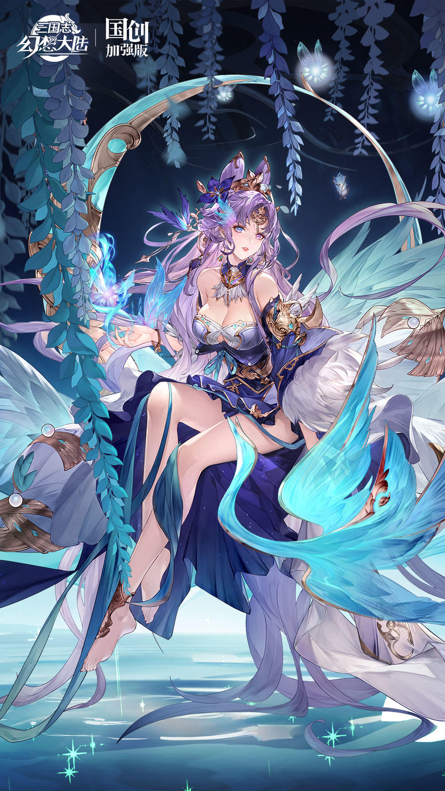 皮肤以蓝紫色为主色调,恰似如水的夜色,以天鹅为皮肤主题,尽显优雅温柔。不同于平日的轻纱曼舞,柔软的羽毛点缀衣袂与身后裙摆,衬托纤细的双腿,她在湖边赤足行走,享受着片刻的静谧安闲。萤火点点,像清幽的蓝色灯火,将一弯新月的倒影托出湖面,在身后默默陪伴她。深林与微风,月色与肤色,湖畔天鹅也被她吸引,为她起舞。