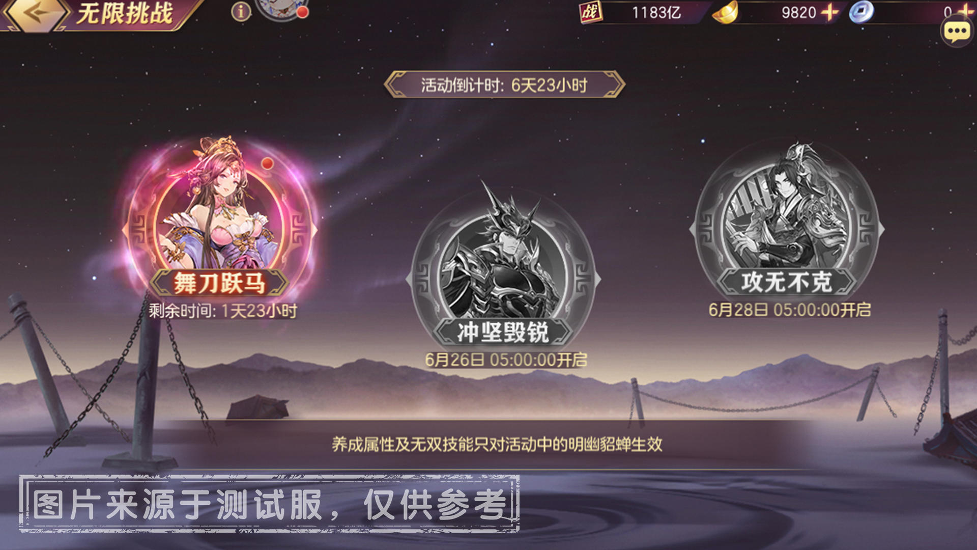 1、可多选挑战条件的全新策略性首领挑战玩法【无限挑战】登场!在活动的第1日,第3日,第5日将分别开启【舞刀跃马、冲坚毁锐、攻无不克】3个阶段的无限挑战。