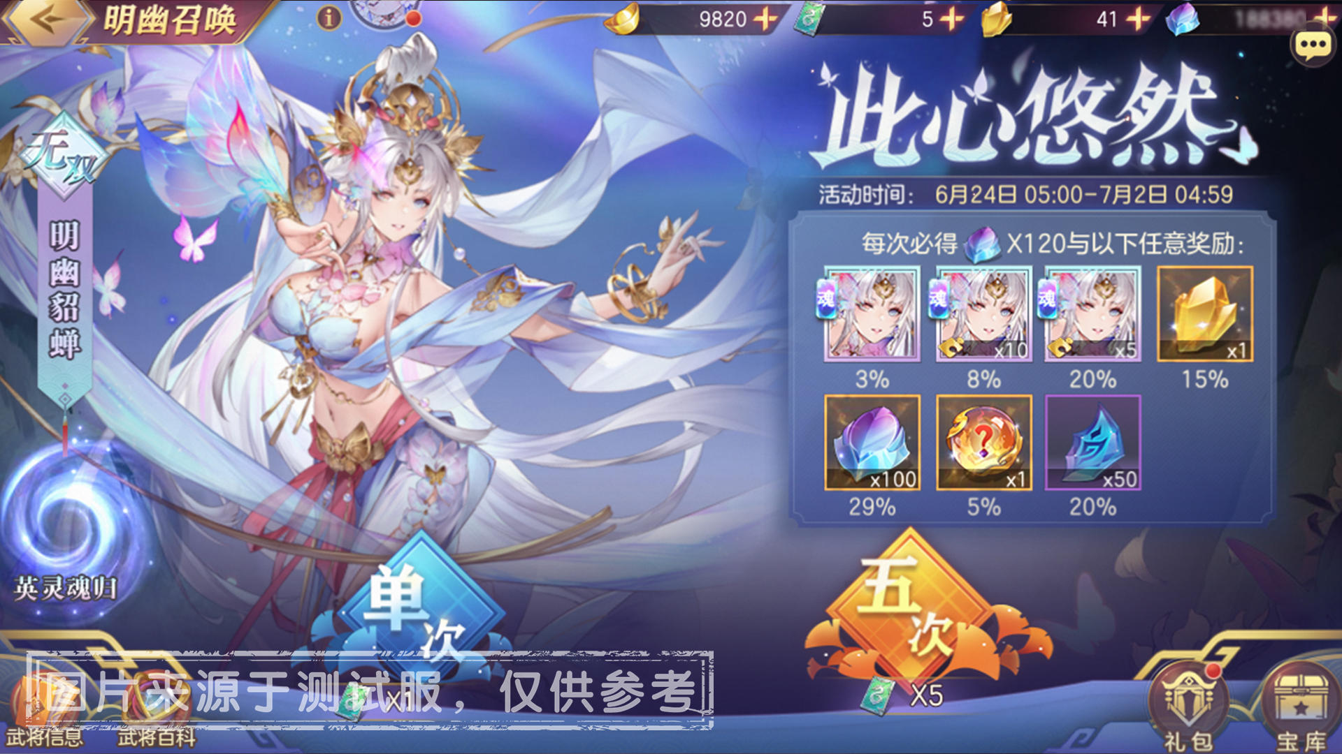 唤魂招募券:可用于【明幽召唤】进行抽取「明幽貂蝉」和「往期魂将」,单价500元宝,活动期间限购60次。