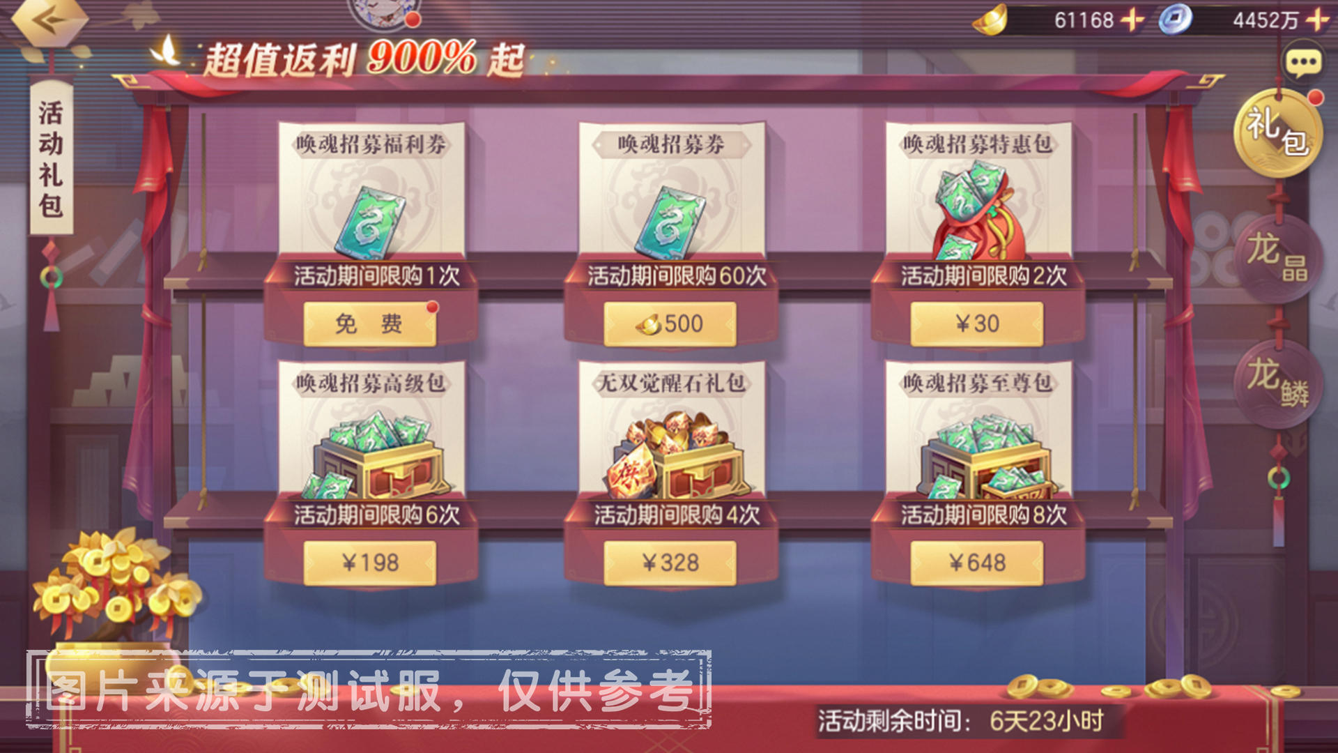 活动期间,限时上线唤魂特惠礼包,超值返利900%起!