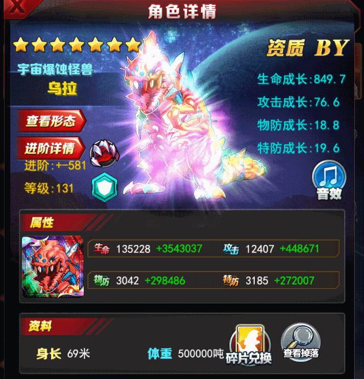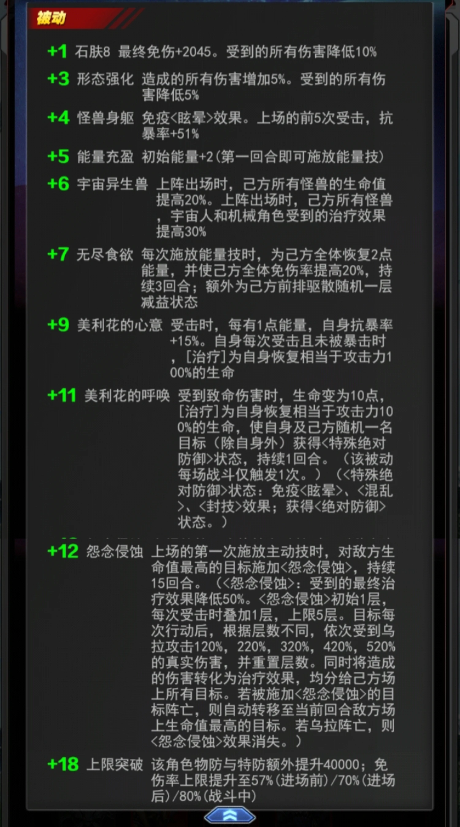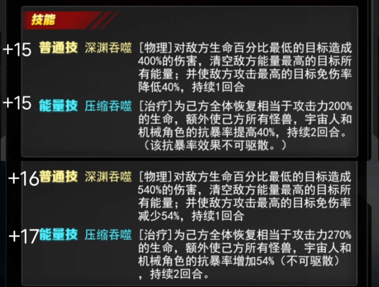 +17能量技 压缩吞噬[治疗]为己方全体恢复相当于攻击力270%的生命,额外使己方所有怪兽,宇宙人和机械角色的抗暴率增加54%(不可驱散),持续2回合。