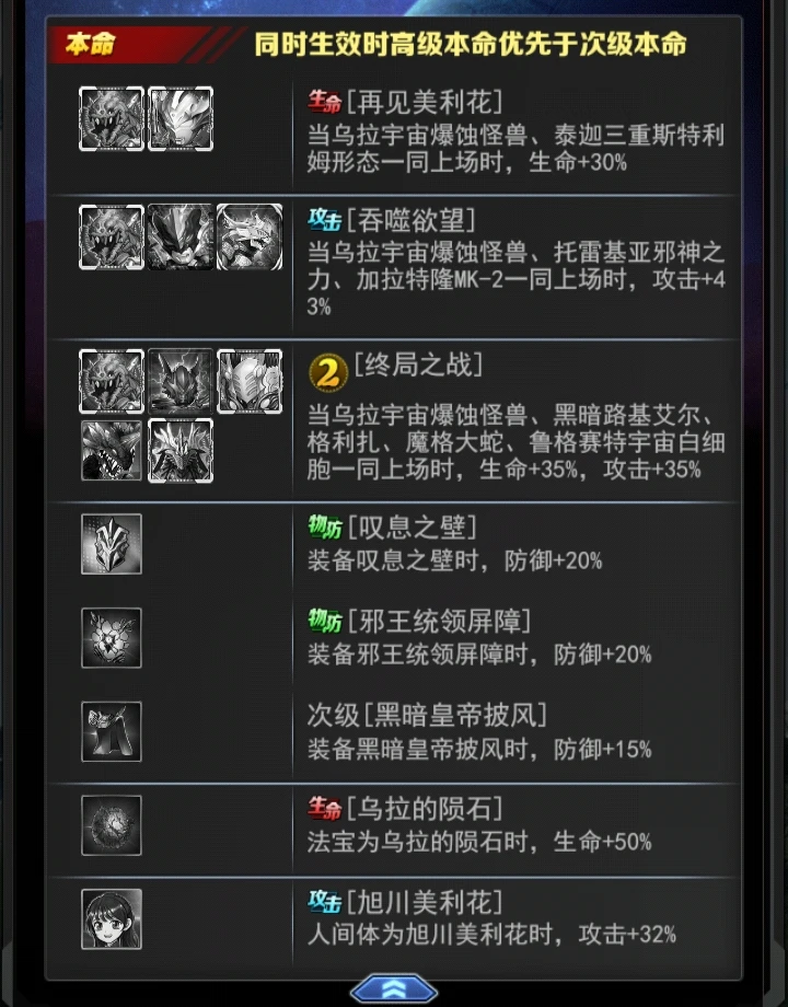+12怨念侵蚀 上场的第一次施放主动技时,对敌方生命值最高的目标施加<怨念侵蚀>,持续15回合。(<怨念侵蚀>:受到的最终治疗效果降低50%。<怨念侵蚀>初始1层,每次受击时叠加1层,上限5层。目标每次行动后,根据层数不同,依次受到乌拉攻击120%,220%,320%,420%,520%的真实伤害,并重置层数。同时将造成的伤害转化为治疗效果,均分给己方场上所有目标。若被施加<怨念侵蚀>的目标阵亡,则自动转移至当前回合敌方场上生命值最高的目标。若乌拉阵亡,则<怨念侵蚀>效果消失。)