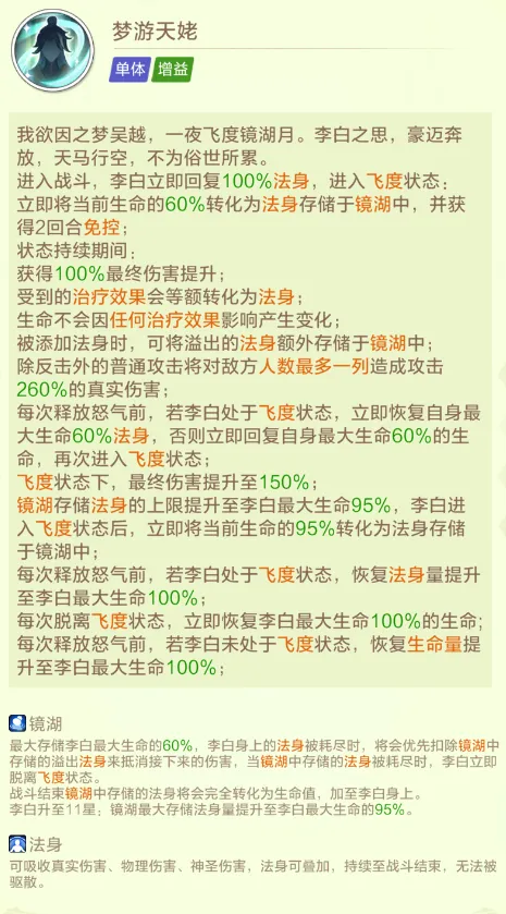 “飞度”是李白的血条转镜湖法身,额外增伤的怒前机制,每次开大前都会重新进行判定!!常驻机制!(开大前无论如何都会重新进入飞度+60%法身,11星+95%,除非被控,或者受减疗禁疗机制影响,还有一个小细节,就是260的普攻1列是在飞渡前期间才有的,要不然就是正常的普普通通平a)。