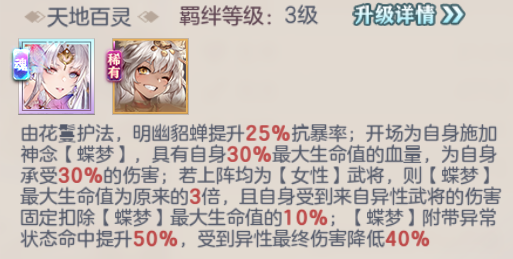 进一步提高明幽貂蝉的额外伤害,并且此额外伤害与神念【蝶梦】的最大生命值绑定,回到羁绊效果,在纯女团阵容中,明幽貂蝉能打出更高的伤害。