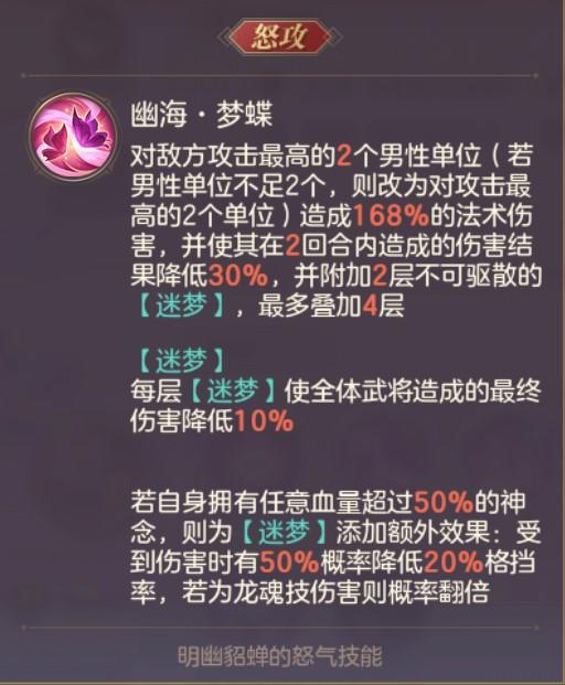 明幽貂蝉的怒攻主要目的是减伤辅助,通过削减对方核心的最终伤害结果和敌方全体的最终伤害来提升全队的承伤能力。另外在明幽貂蝉自身的神念【蝶梦】拥有50%以上血量时,还能降低对方的稀有属性“格挡率”,大幅提高我方有效输出。
