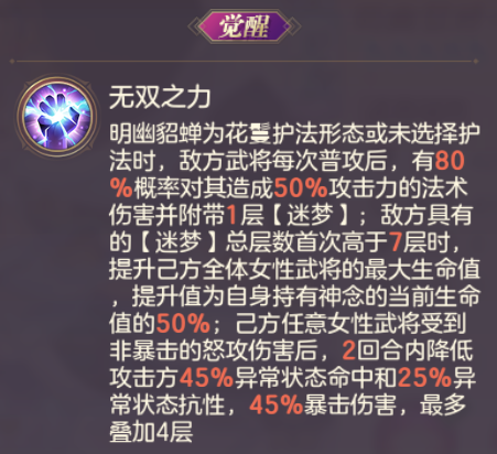 花鬘护法为明幽貂蝉自身提供可以为其分摊伤害的神念【蝶梦】,【蝶梦】主要能为明幽貂蝉提供高额的异常状态命中属性,并且提升明幽貂蝉在受到对面男性武将攻击时的坦度。