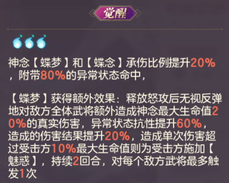 强化神念【蝶梦】的承伤能力,为明幽貂蝉自身提供巨量异常命中。还能提高貂蝉怒攻的额外伤害和异常抗性,让明幽貂蝉输出生存资质更上一层楼,更重要的是给予明幽貂蝉额外控制频次,每次怒攻都可能额外施加魅惑。