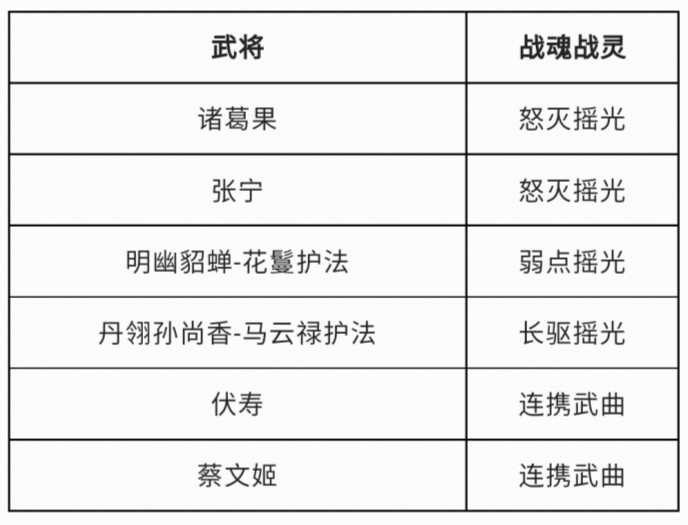 武将:诸葛果、张宁、明幽貂蝉-花鬘护法、丹翎孙尚香-马云禄护法、伏寿、蔡文姬