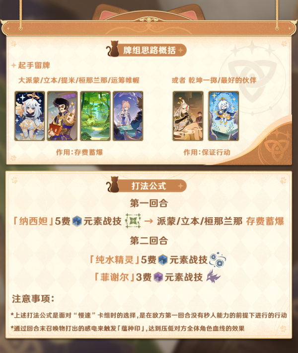 「运筹帷幄」:经典的过牌卡,即时抽卡的性质让其能够在残局时用来抽取一些反打的关键卡。也可以在开局没有「立本」或「派蒙」时,用「桓那兰那」存2费,用该卡消耗剩余1费。