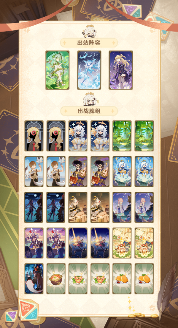 「派蒙」:蓄爆常用卡牌,可以在骰子较差时,利用3个同色废骰子为后续2个回合提供万能骰子,保证输出节奏的同时,也为后续回合的行动提供了更多选择。在该卡组中常用在“第一/第二回合”,“第三回合”已经快接近战斗尾声,使用该卡可能会得不偿失。