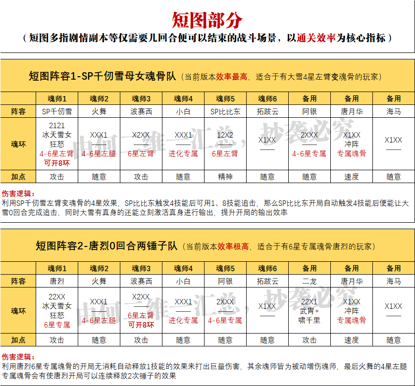 首先目前在短图上,最为有效的阵容便是唐晨开局0回合两锤子打法和SP千仞雪的开局真身爆发打法,这两套阵容中,唐烈阵容的要求稍微一些,而大雪的魂骨、魂师要求则更高,不过同练度下的伤害还是大雪这个阵容要更高一些,所以大家可以按照自己的客观情况来进行选择即可。