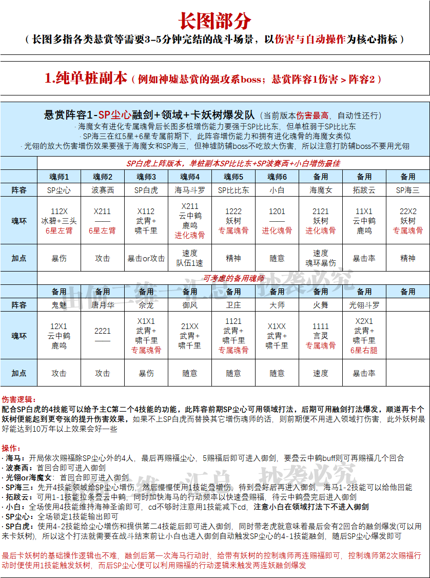 接着在长图悬赏部分,此次维一也是将这部分内容给分割为了强攻、控制、敏攻、防辅四小部分进行分别说明,其中这个强攻系单桩boss部分,目前最强的打法已经是SP尘心的融剑爆发+卡妖树打法,这玩意一般来说如果你练度尚可,同时拥有15万-20万年以上的妖树魂环,则可以稳定的超过SP白虎的记录值打法了,而且整个操作的自动型其实吧还好,就是开头和结尾最好手动一下免得出错即可。