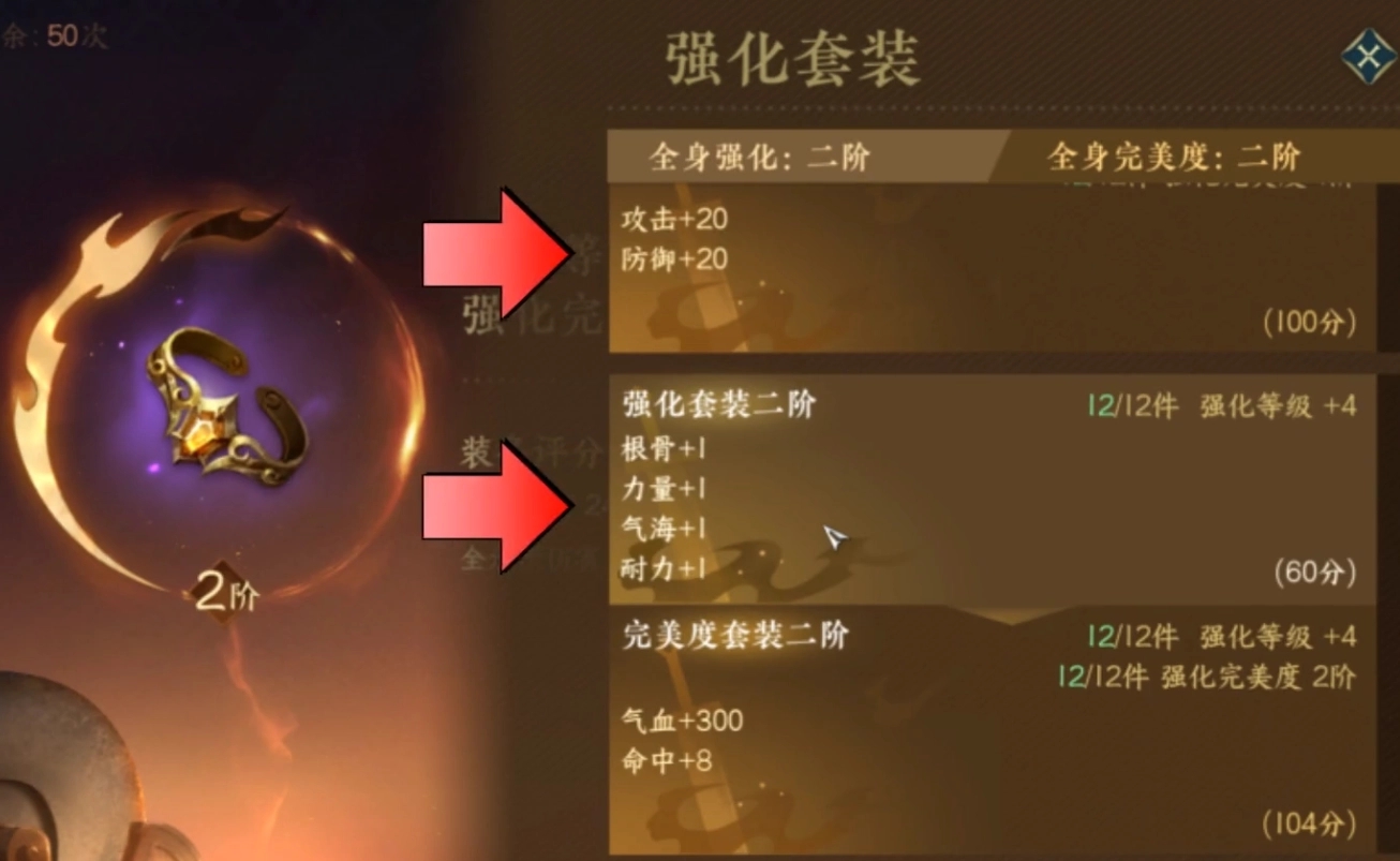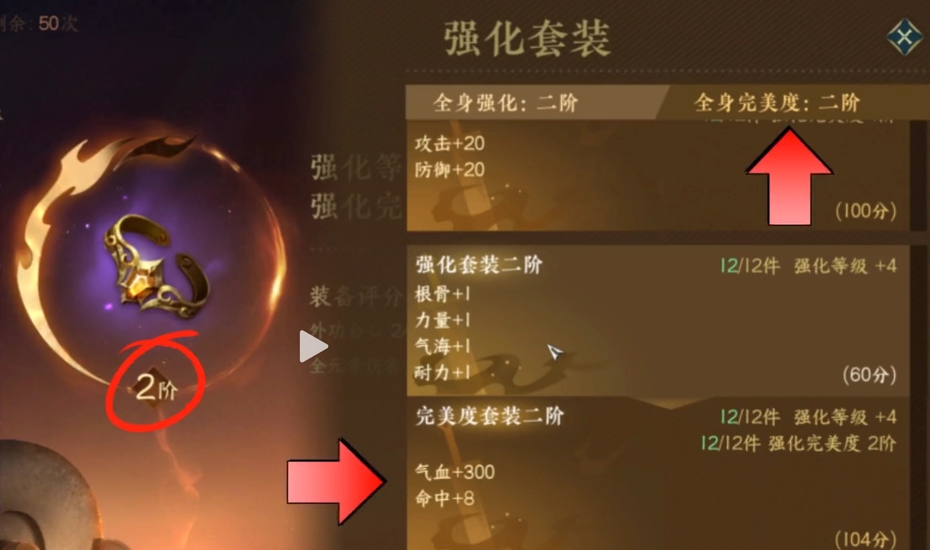 二、装备强化等级和强化完美阶层有套装效果奖励,强化等级套装属性12件装备全部强化至几级,就会获得相应的套装属性。这里一定要注意平均强化等级,比如每件装备都强化到两级后,再开始强化三级,这样可以让有限的解玉砂强化出套装效果。