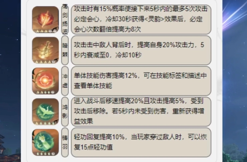 PVE内功推荐三金三木,金内功为九灵爆发时打出高额会心伤害做准备,木内功为九灵弥补位移少,减少技能CD,更好的在暴灵状态下,释放更多技能做准备。推荐一套毕业内功,荡剑扬波,暗疾,冲虚。鸿影,铸羽。