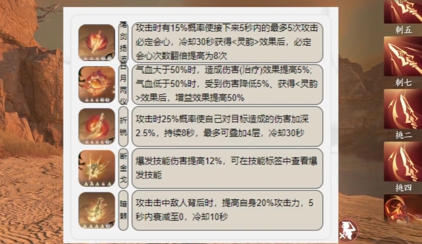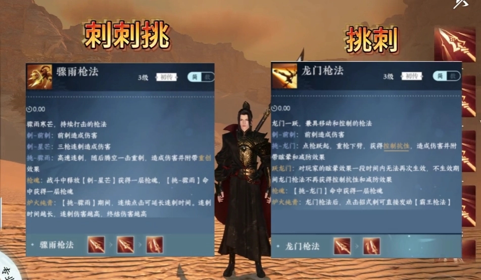 首先加点主点根骨增加自己的坦度,毕竟坦度上来了,在前排还是非常舒服的。副点力量增加自己的攻击,只会有两个攻击按钮,一个刺,一个挑,两个搭配起来可以使用出六种枪法,不过最常用的只有两种,PVE刺刺挑可以打出高额伤害,PVP挑刺带眩晕和小段位移。