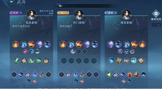 逆水寒手游还有推荐武功设置,打开武功,点击左下角的武学套路,是可以提前预设不同的玩法技能和内功组合的,如果是新手玩家也可以点击右上角的三个点来使用推荐套路,这里有大神热门以及系统推荐三种,非常适合新手玩家选择技能与流派。