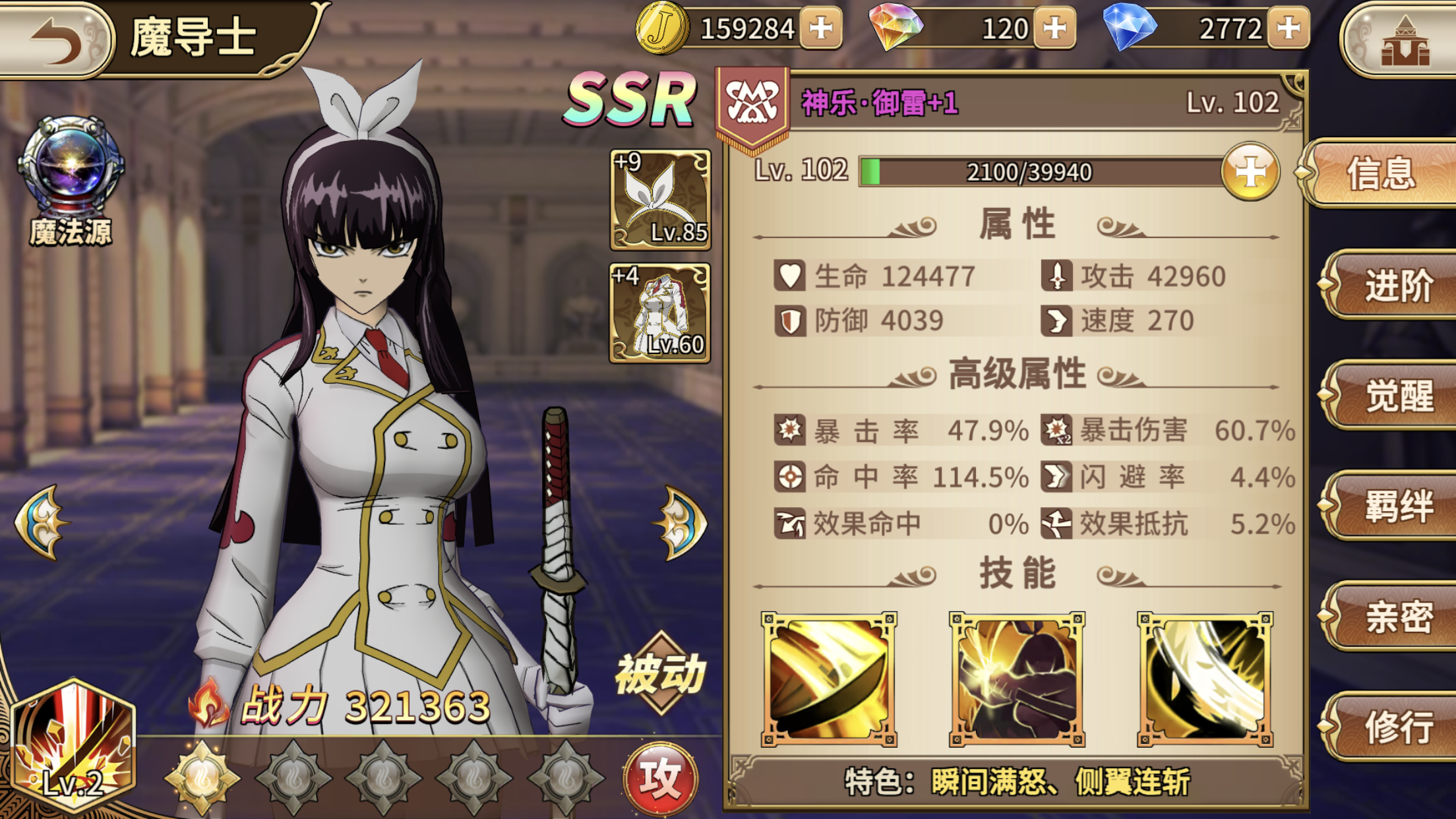 推荐理由:长的好看是不是就够了?单体最强输出,2回合内可出手5次(普攻+必杀技+普攻+被动攻击+单体必杀技)。无论是竞技场、关卡、秘境都是强力角色,完美契合神乐、艾露莎。魔法源推荐:2均衡+2猛攻+2飞燕(或2穿云)+魔力爆发。这里说明一下,米拉杰现阶段速度是劣势,想比神乐先起手,为神乐3连斩创造环境就必须在魔法源选择上有所牺牲,如果佩戴重击剥离虽能先手放大,但会牺牲1次普通攻击并导致虐杀叠层节奏混乱。所以以自身减少8%攻击为代价换取神乐的秒天秒地绝对不亏。(多些血量也能更好配合自身叠加闪避的实战效果)