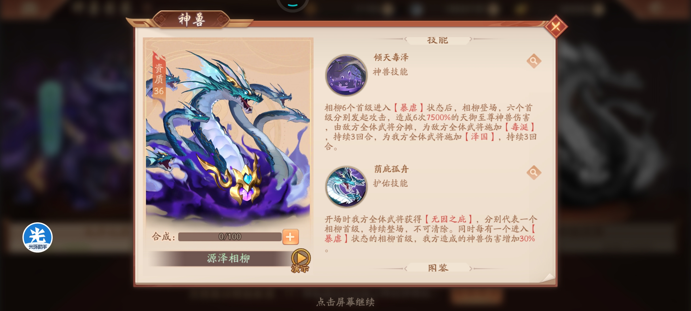 相柳6个首级进入【暴虐】状态后,相柳登场,六个首级分别发起攻击,造成6次7500%的天御至尊神兽伤害,由敌方全体武将分摊,为敌方全体武将施加【毒涎】,持续3回合,为我方全体武将施加【泽国】,持续3回合。
