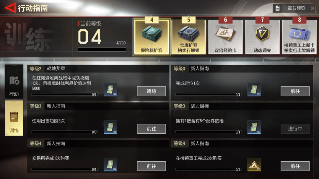 进入行动指南页面,个人等级达到4级和30级的任务,各能获得一格保险箱永久扩容奖励。