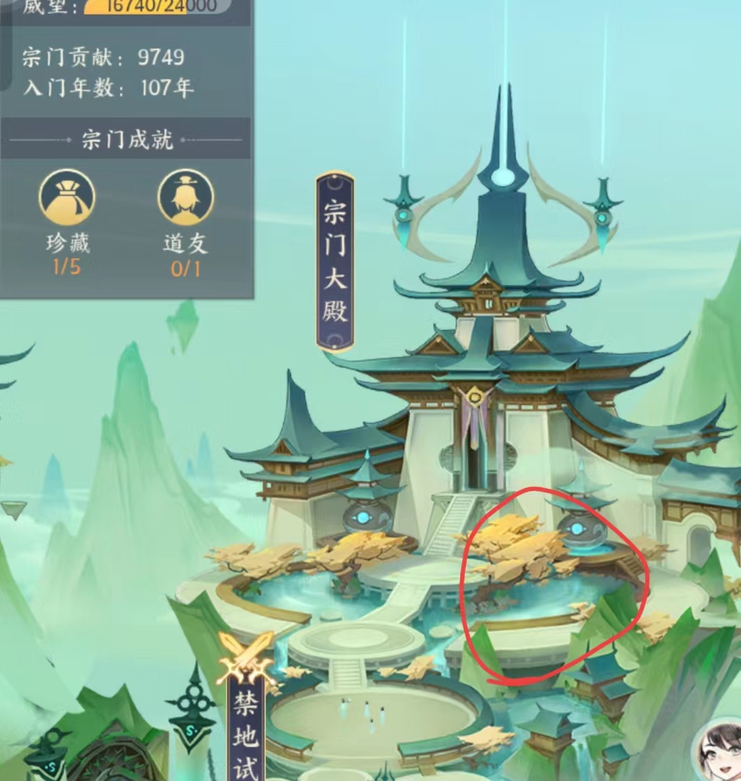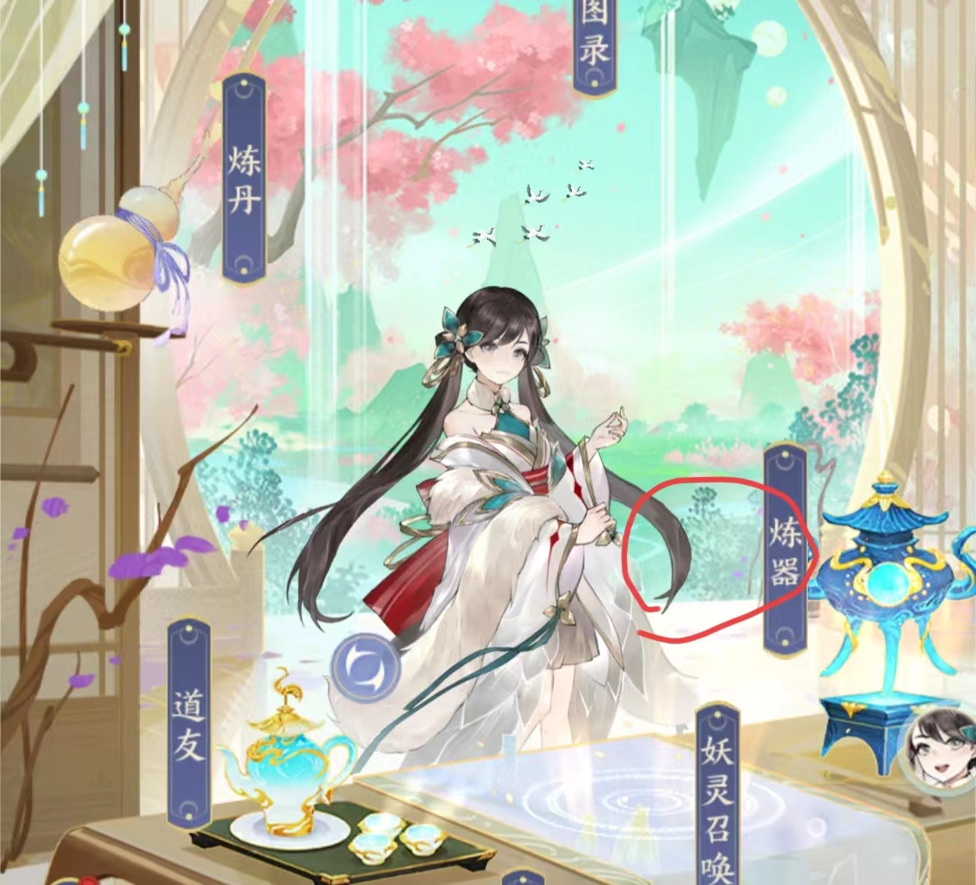 ②第二个物品【仙草枝】获取地点第二个物品【仙草枝】拿到白瓷锅一天以后,在【洞府】练器的左边有颗小草,点击小草,大约点击20-30次左右就可以获取。在我图中红色圈圈标记的位置。