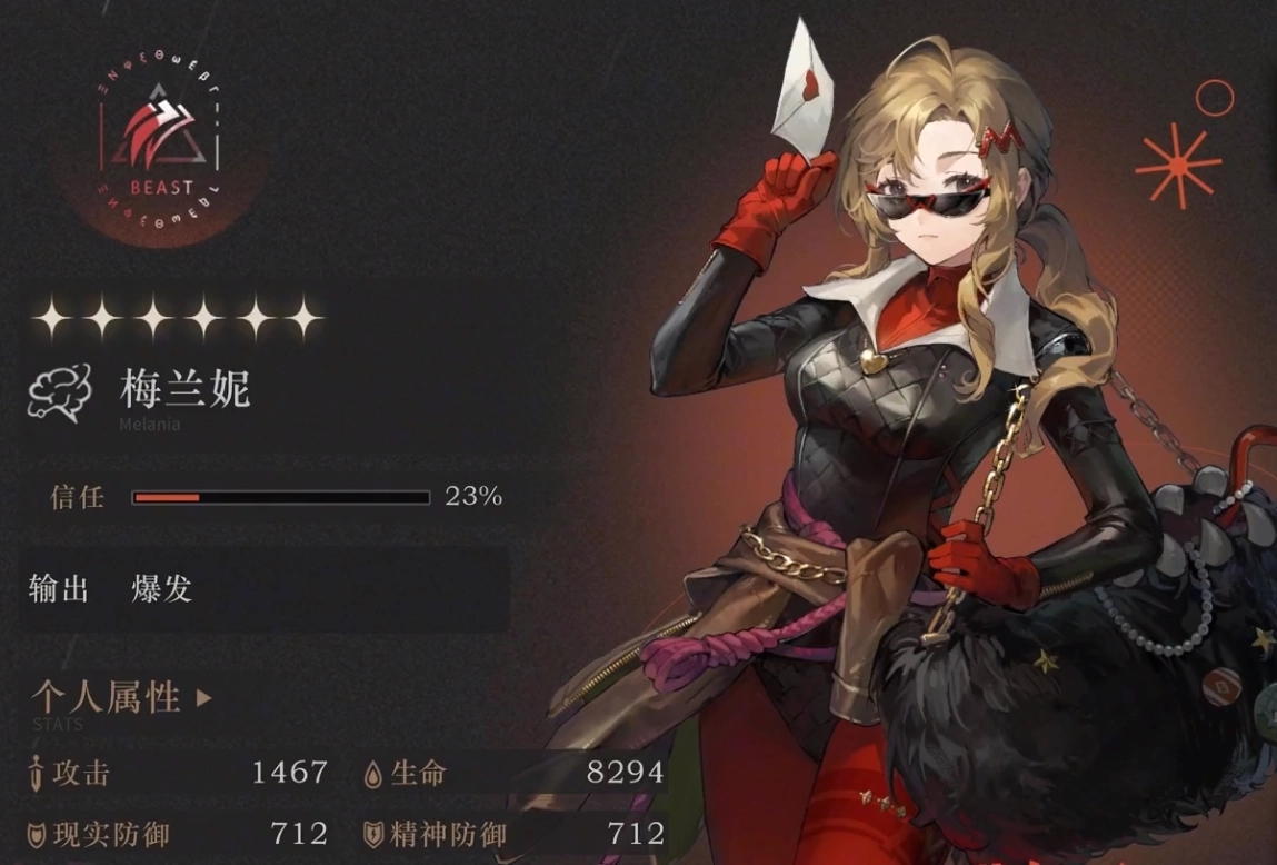 梅兰妮新版本体验报告Zck发布于 2023-06-29关注新六星梅兰妮节奏爆火,上线之前都觉得超模,实际上手体验才发现强度他有的不多,角色特点是靠单体大招输出操作卡手,但伤害还行,独特的效果使他的小技能可以偷取敌方的激情,大家最后都是要靠大招打伤害的。梅兰妮的存在并没有影响到现有卡池里任何一个六星的地位,所以不管抽没抽的都没问题。 新活动的新心相名为大娱乐至上,加成很高,限制很多,目前可以鉴定为梅兰妮的专属武器,各项磁条完美契合梅兰妮,已经抽了梅兰妮,并且将梅兰妮当成主C培养的小伙伴,请务必将这个心相换上。 梅兰妮配该心相加成十分明显,没有抽梅兰妮或者不打算培养梅兰妮的小伙伴也建议换上一个放在仓库,活动资源给的很多,加上这是免费的限定六星心相,换了放着绝对不亏。