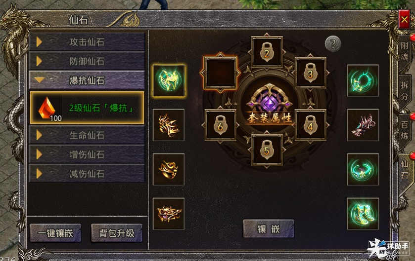 攻略-仙石镶嵌及升级勤勉搬运的后辈君发布于 2023-06-29关注《伏龙》世界中,修炼仙石可助力勇士们提升角色力量,勇猛征战龙城。以下关于仙石镶嵌及升级的内容,欢迎查阅喔!1.在右侧铸造功能界面,可以进行仙石合成及镶嵌,100级开放2.仙石是镶嵌在部位上,不会随装备掉落3.仙石分为攻击、防御、爆抗、生命、增伤、减伤等属性仙石4.仙石可以在二大陆试练塔中获得