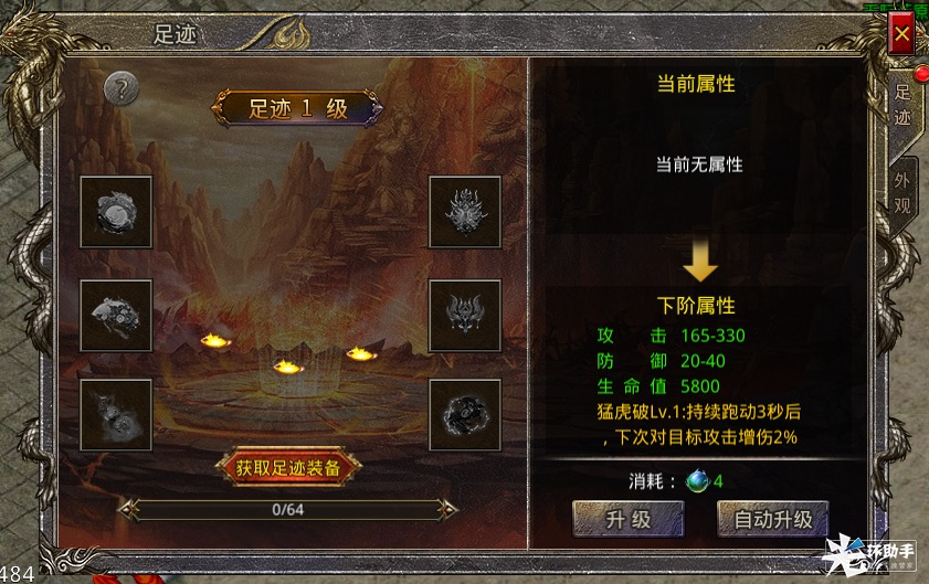 攻略-足迹系统勤勉搬运的后辈君发布于 2023-06-29关注征战龙城的过程中,如影随形的炫酷足迹是勇士们不可或缺的装备,一起来看看《伏龙》的足迹系统有什么值得关注的要点吧~1.五大陆开启,开启条件为开服第三天,转生25转2.足迹系统提升可获得攻击、防御、生命属性,额外获得猛虎破buff,持续移动3秒后造成攻击增伤3.足迹装备可以通过掉落及合成获得,单件装备增加攻击、生命、防御,套装增加足迹系统属性及对怪额外斩杀buff