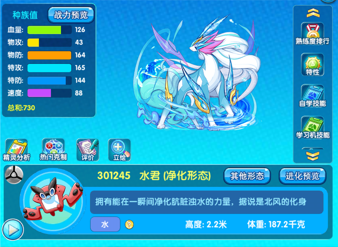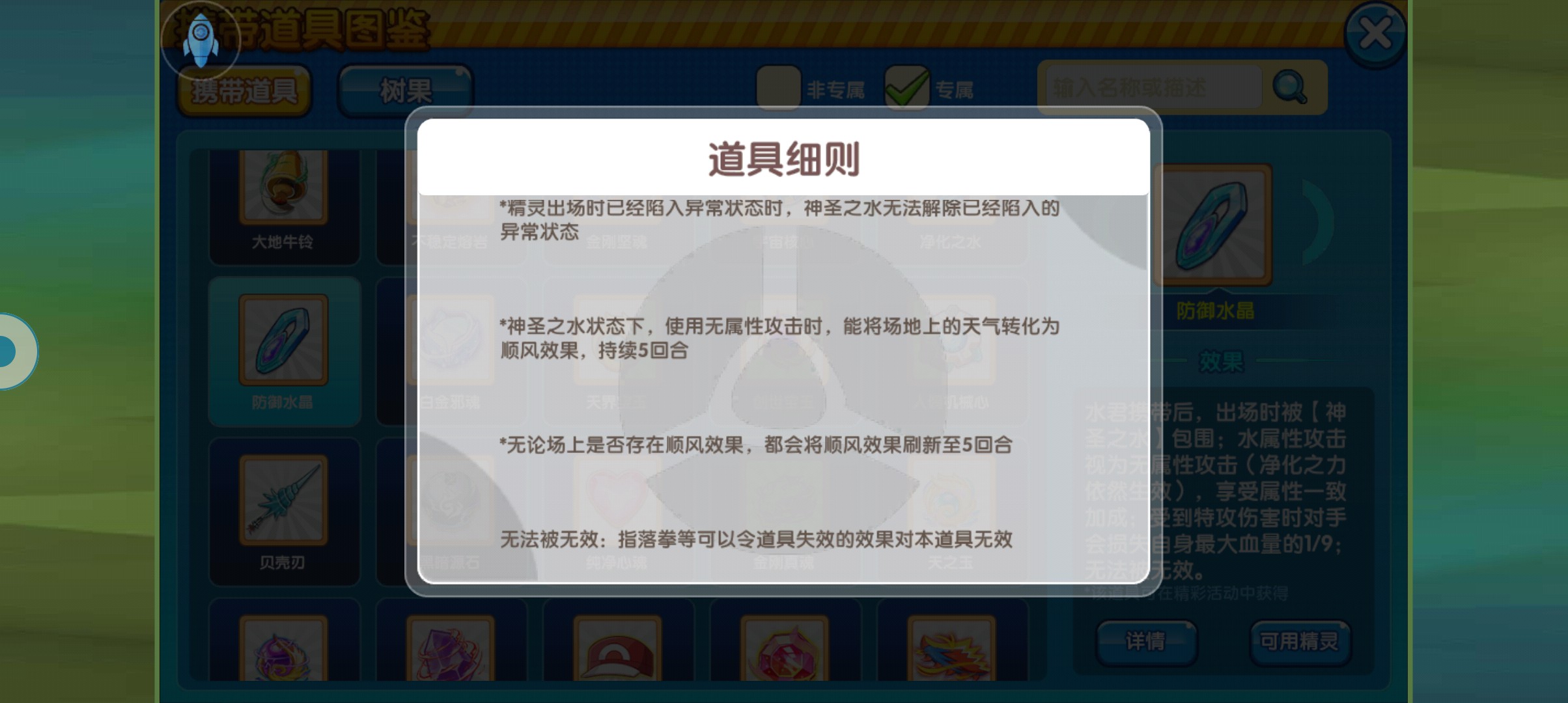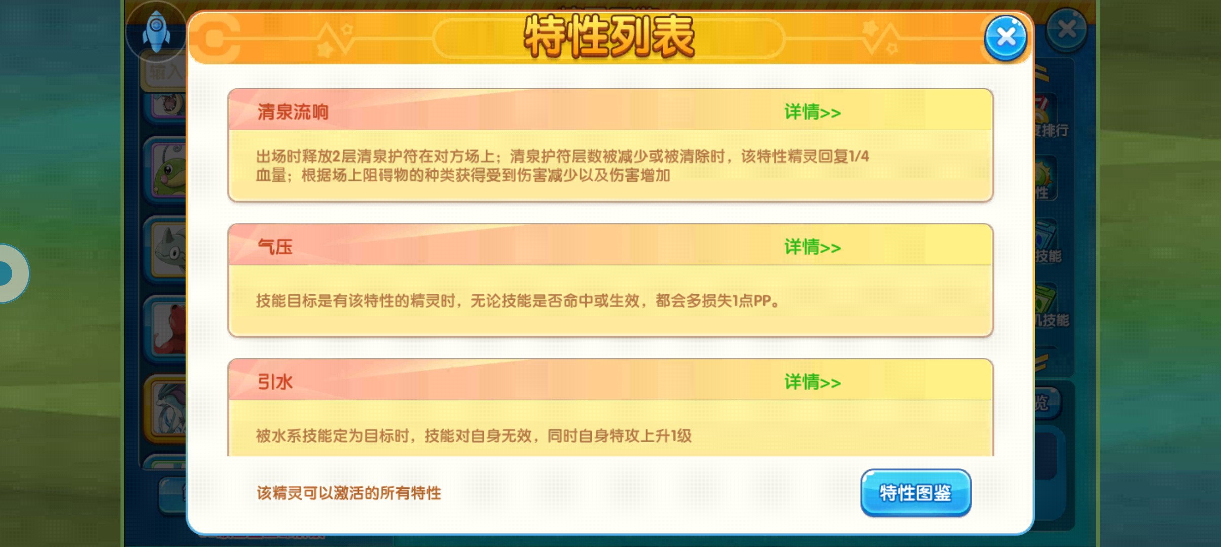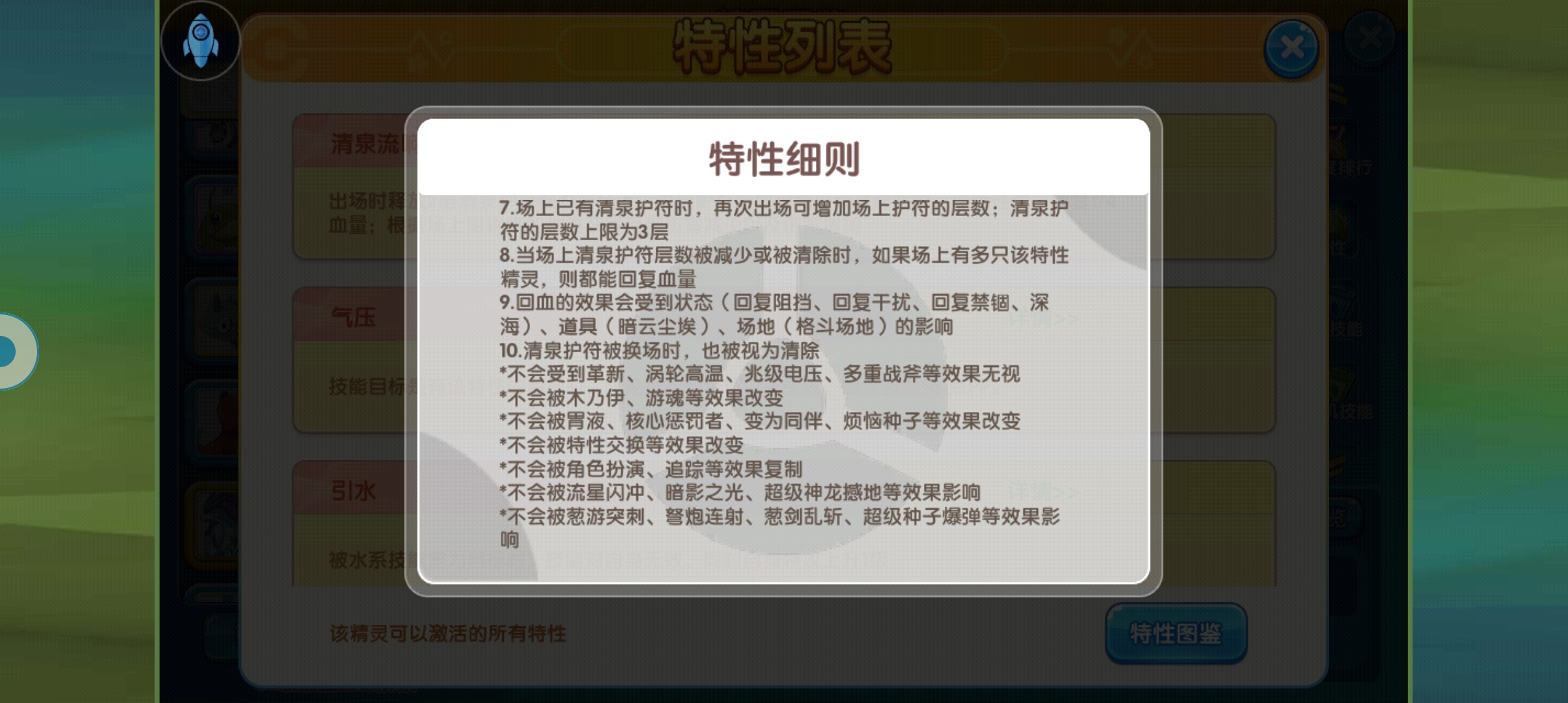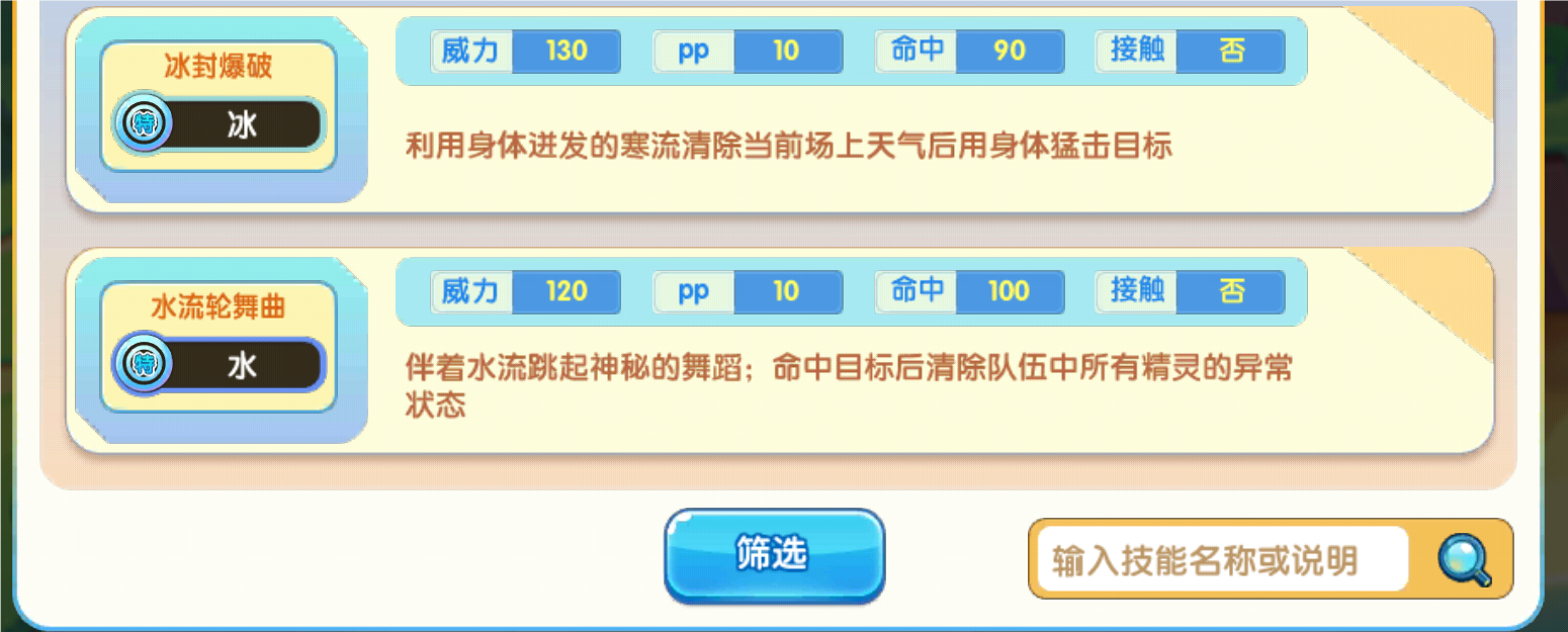 那么还有两个专属技能,一个是能够清除背包里面队友所有异常状态的招式,还有一个就是可以清除天气是一个冰属性的招式,不过这两个技能暂时没有获取方式,就算有也是需要氪金,所以暂时不需要这两个技能。平民玩家想要玩水君的话这两个技能也不是特别的需要,因为有了专属的效果,直接把天气转化为顺风,效果不比直接解除更香,这里还需要说一下,如果想要拥有这个效果的话,如果能在阵容里面搭配一些天气宠物可能会更好。
