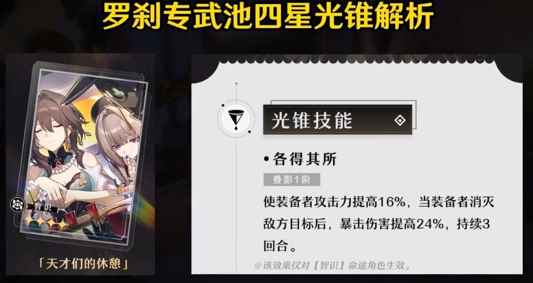 第一张智识光锥天才们的休憩,是现阶段排名第三的智识光锥,如果你的景元没有专武也没有大月卡光锥,它是比较好的下位替代。