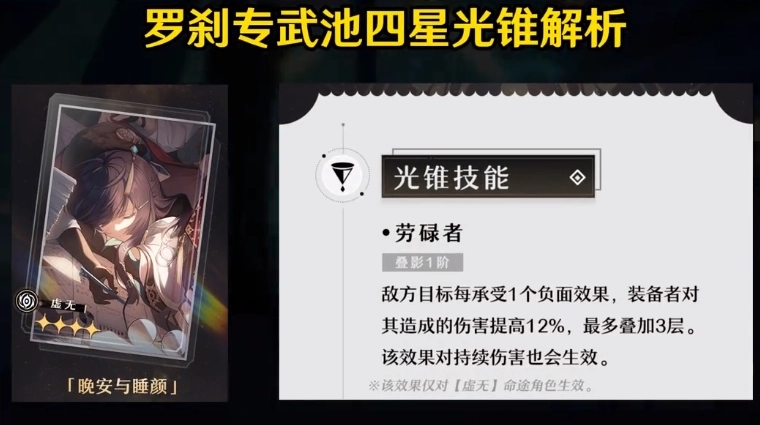 第二张虚无光锥,晚安与睡颜,这张光锥适合输出型的杨叔和后续卡夫卡版本dot玩法的桑博和卢卡,总结来说就是策划为1.2版本角色提前准备的虚无四星光锥。