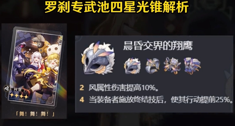第三张同谐光锥舞!舞!舞!一张适用于混沌回忆抢回合数的光锥,而且多个舞!舞!舞!以及四风套的效果也是可以相互叠加的,目前也是唯一一个可以提升全队行动条的光锥,想想都让人心动。