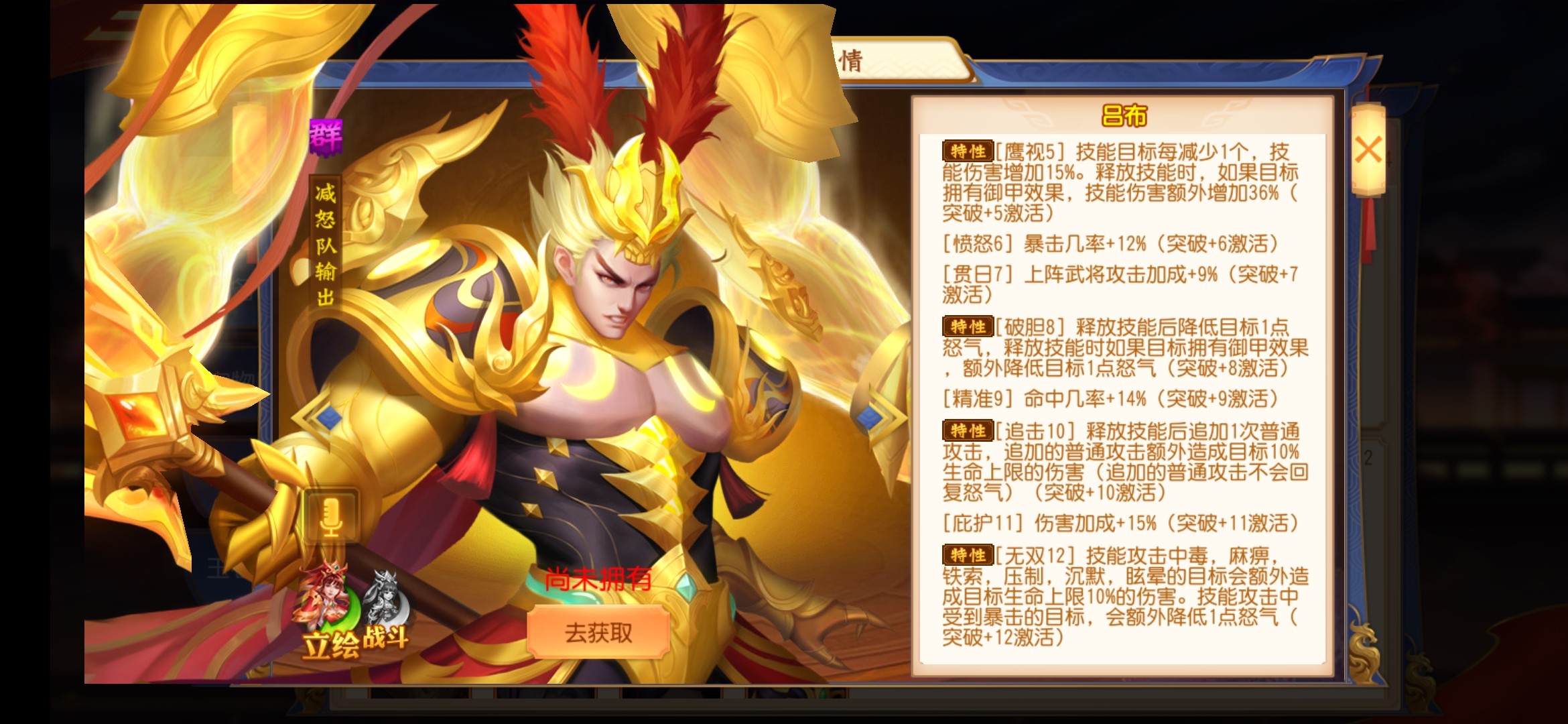 群雄吕布主减怒不求输出因为吕布基本打不了人所以以固若金汤广夏金关羽金色典韦以及典韦,剩下的就是普通的了。。主要的还是要吕布生存能力强起来