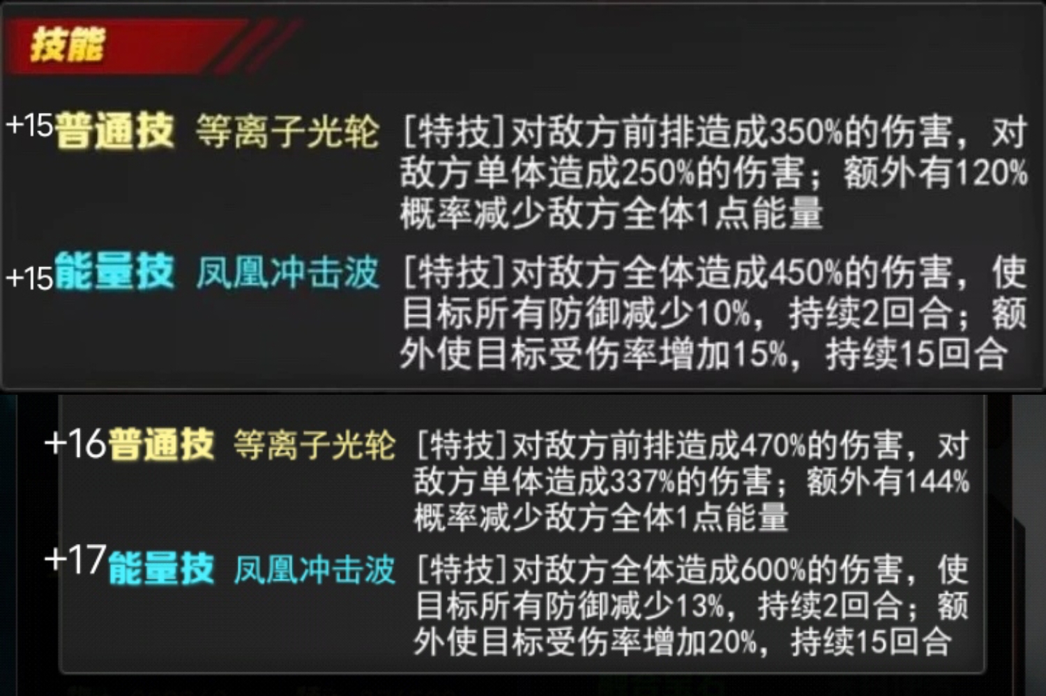 +17能量技凤凰冲击波[特技]对敌方全体造成600%的伤害,使目标所有防御减少13%,持续2回合;额外使目标受伤率增加20%,持续15回合